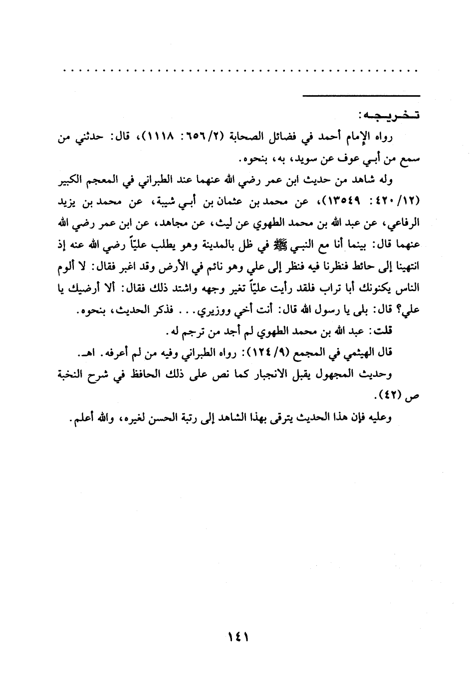 وله شاهد من حديث ابن عمر رضي الله عنهما عند الطبراني في المعجم الكبير (12/ 420: 13549)، عن محمد بن عثمان بن أبي شيبة، عن محمد بن يزيد الرفاعي، عن عبد الله بن محمَّد الطهوي عَنْ لَيْثٍ، عَنْ مُجَاهِدٍ، عَنِ ابْنِ عُمَرَ رضي الله عنهما قال: بينما أَنَا مَعَ النَّبِيِّ -صَلَّى اللَّهُ عَلَيْهِ وَسَلَّمَ- فِي ظل بالمدينة وهو يطلب عليًّا رضي الله عنه إذ انتهينا إلى حائط فنظرنا فيه فنظر إلى علي وهو نائم في الأرض وقد اغبر فقال: لا ألوم الناس يكنونك أبا تراب فلقد رأيت عليًّا تغير وجهه واشتد ذلك فقال: ألا أرضيك يا علي؟ قال: بلى يا رسول الله قال: أنت أخي ووزيري ... فذكر الحديث، بنحوه.