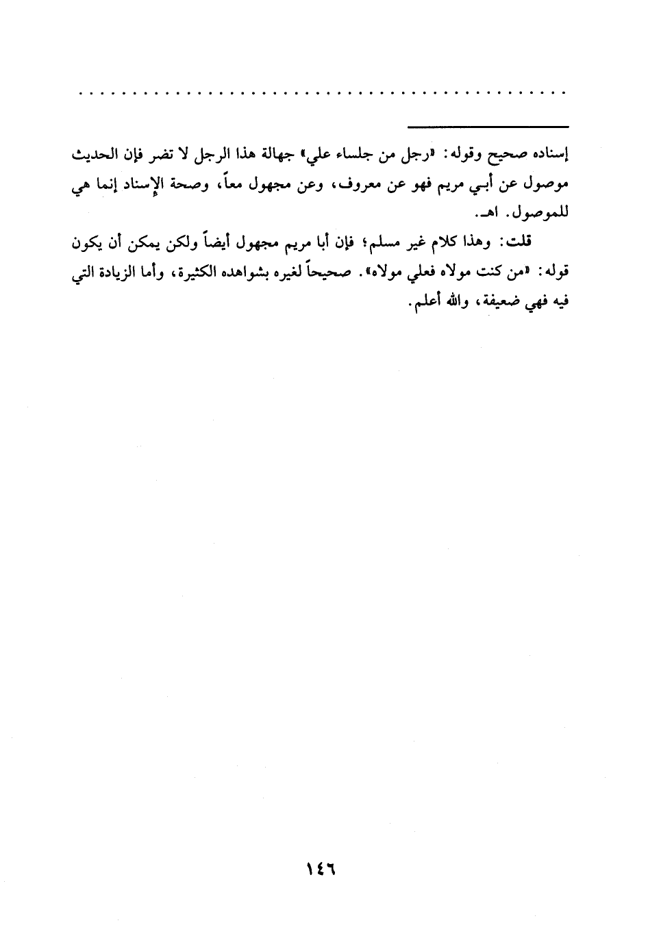 قلت: وهذا كلام غير مسلم؛ فإن أبا مريم مجهول أيضًا ولكن يمكن أن يكون قوله: "من كنت مولاه فعلي مولاه". صحيحًا لغيره بشواهده الكثيرة، وأما الزيادة التي فيه فهي ضعيفة، والله أعلم.
