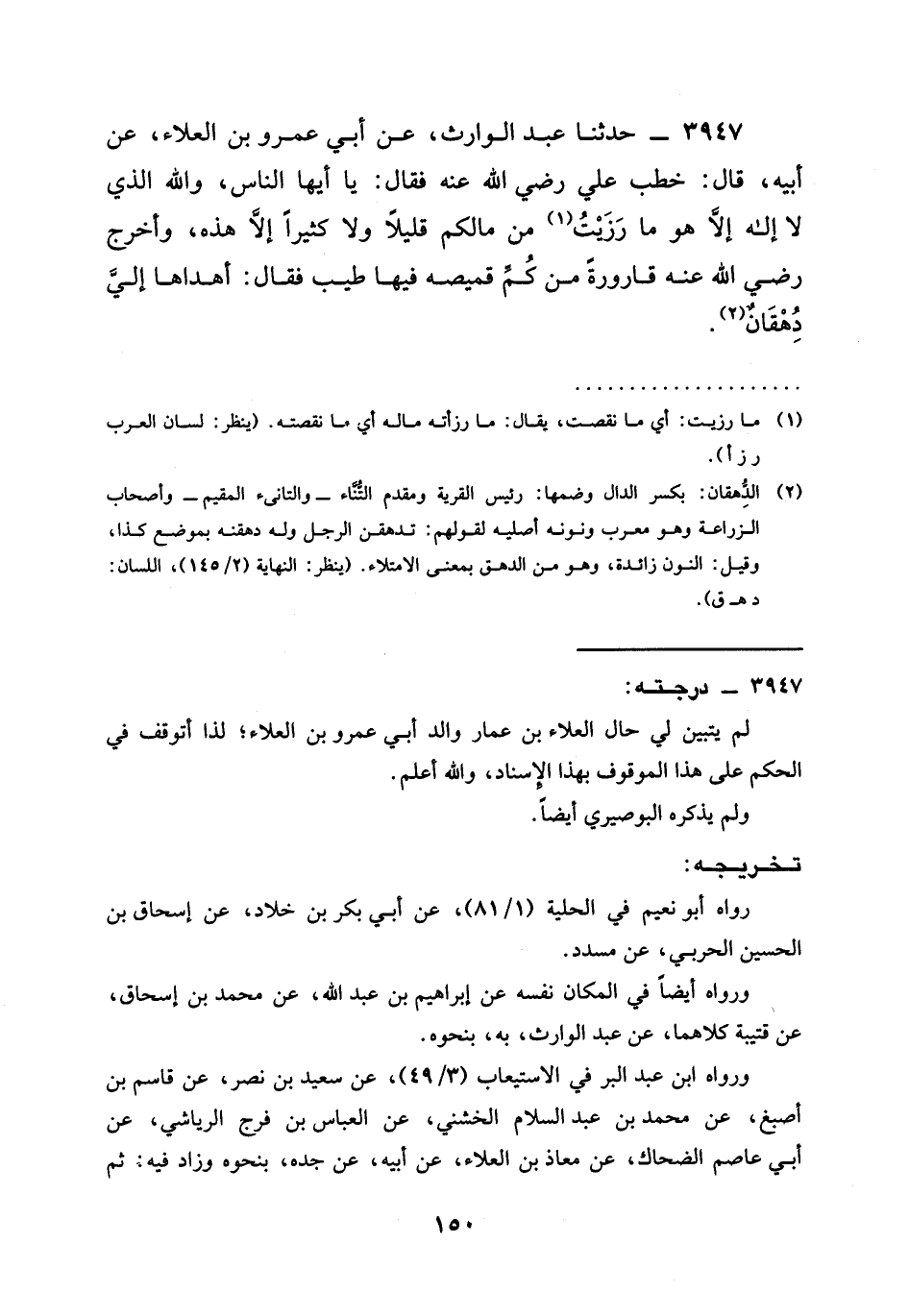 3947 - حَدَّثَنَا عَبْدُ الْوَارِثِ، عَنْ أَبِي عَمْرِو بْنِ الْعَلَاءِ، عَنْ أَبِيهِ، قَالَ: خَطَبَ عَلِيٌ رَضِيَ الله عَنْه فَقَالَ: يَا أَيُّهَا النَّاسُ، وَاللَّهِ الَّذِي لَا إِلَهَ إِلَّا هو §ما رَزَيْتُ مِنْ مَالِكُمْ قَلِيلًا وَلَا كَثِيرًا إِلَّا هَذِهِ، وَأَخْرَجَ رَضِيَ الله عَنْه قَارُورَةً مِنْ كُمِّ قَمِيصِهِ فِيهَا طِيبٌ فَقَالَ: أَهْدَاهَا إِلَيَّ دِهْقَانٌ.