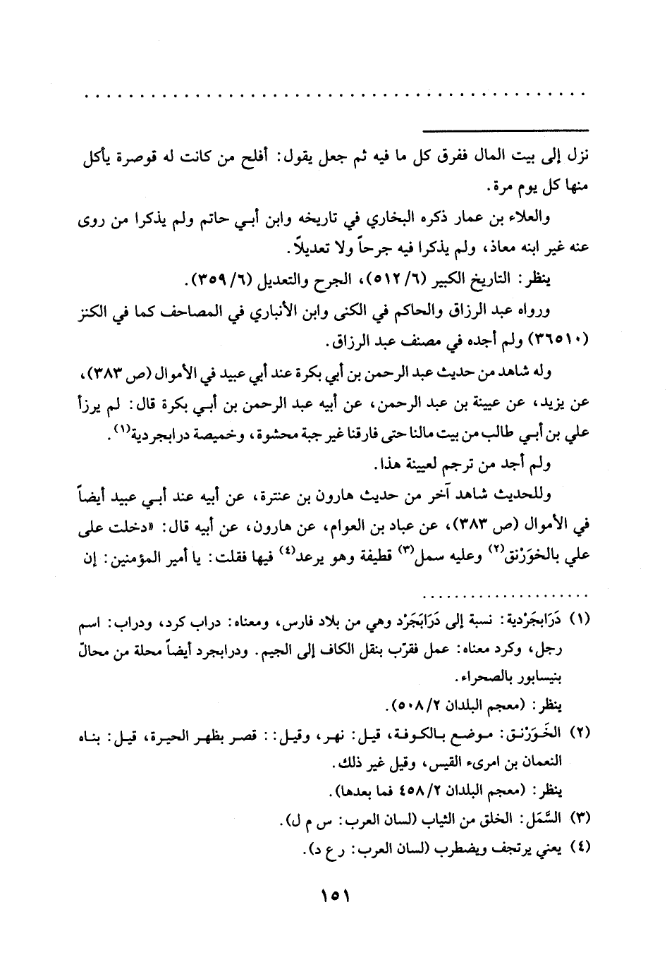 وله شاهد من حديث عبد الرحمن بن أبي بكرة عند أبي عبيد في الأموال (ص 383)، عن يزيد، عن عيينة بن عبد الرحمن، عن أبيه عبد الرحمن بن أبي بكرة قال: لم يرزأ علي بن أبي طالب من بيت مالنا حتى فارقنا غير جبة محشوة، وخميصة درابجردية (¬1).