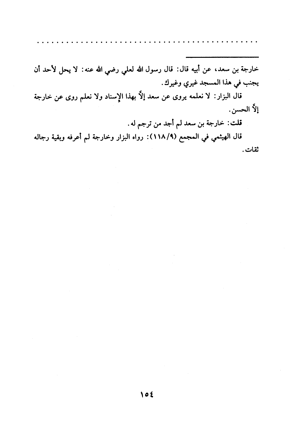 = خارجة بْنِ سَعْدٍ، عَنْ أَبِيهِ قَالَ: قَالَ رَسُولُ الله لعلي رضي الله عنه: لا يحل لأحد أن يجنب في هذا المسجد غيري وغيرك.
