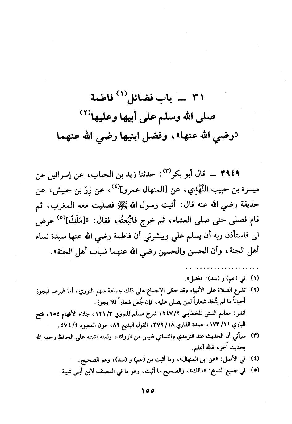 3949 - قَالَ أَبُو بَكْرٍ: حدثنا زَيْدُ بْنُ الْحُبَابِ، عَنْ إِسْرَائِيلَ عَنْ مَيْسَرَةَ بْنِ حَبِيبٍ النَّهْدِيِّ، عَنِ [الْمِنْهَالِ عَمْرٍو] ، عَنْ زِرِّ بْنِ حُبَيْشٍ، عَنْ حُذَيْفَةَ رَضِيَ الله عَنْه قَالَ: أَتَيْتُ رَسُولَ اللَّهِ صَلَّى اللَّهُ عَلَيْهِ وَسَلَّمَ فَصَلَّيْتُ مَعَهُ الْمَغْرِبَ، ثُمَّ قَامَ فَصَلَّى حَتَّى صَلَّى الْعِشَاءَ، ثُمَّ خَرَجَ فَاتَّبَعْتُهُ، فَقَالَ: " [§مَلَكٌ] عَرَضَ لِي فَاسْتَأْذَنَ رَبَّهُ أَنْ يُسَلِّمَ عَلَيَّ وَيُبَشِّرُنِي أن فاطمة رَضِيَ الله عَنْها سَيِّدَةُ نِسَاءِ أَهْلِ الْجَنَّةِ، وَأَنَّ الحسن والحسين رَضِيَ الله عَنْهما شَبَابِ أَهْلِ الْجَنَّةِ ".