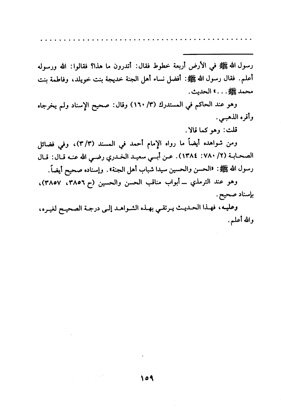 = رسول الله -صلى الله عليه وسلم- في الأرض أربعة خطوط فقال: أتدرون ما هذا؟ فقالوا: الله ورسوله أعلم. فَقَالَ رَسُولُ اللَّهِ -صَلَّى اللَّهُ عَلَيْهِ وَسَلَّمَ-: أفضل نساء أهل الجنة خديجة بنت خويلد، وفاطمة بنت محمد -صلى الله عليه وسلم- ... " الحديث.