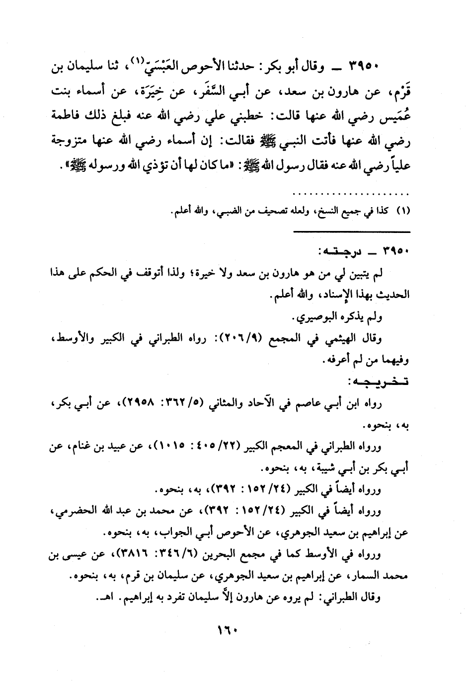 3950 - وَقَالَ أَبُو بَكْرٍ: حَدَّثَنَا الْأَحْوَصِ الْعَبْسِيُّ، ثنا سُلَيْمَانُ بْنُ قَرْمٍ، عَنْ هَارُونَ بْنِ سَعْدٍ، عَنْ أَبِي السَّفَرِ، عَنْ خِيرَةَ، عَنْ أَسْمَاءَ بنت عميس رَضِيَ الله عَنْها قَالَتْ: خَطَبَنِي عَلِيٌّ رَضِيَ الله عَنْه فَبَلَغَ ذلك فاطمة رَضِيَ الله عَنْها فَأَتَتِ النَّبِيَّ صَلَّى اللَّهُ عَلَيْهِ وَسَلَّمَ فَقَالَتْ: §إن أسماء رَضِيَ الله عَنْها مُتَزَوِّجَةٌ عَلِيًّا رَضِيَ الله عَنْه فَقَالَ رَسُولُ اللَّهِ صَلَّى اللَّهُ عَلَيْهِ وَسَلَّمَ: " مَا كَانَ لَهَا أَنْ تُؤْذِيَ اللَّهَ وَرَسُولَهُ صَلَّى اللَّهُ عَلَيْهِ وَسَلَّمَ ".