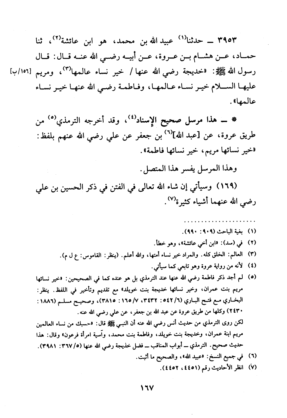 3953 - حدثنا عُبَيْدُ اللَّهِ بْنُ مُحَمَّدٍ، هُوَ ابْنُ عَائِشَةَ، ثنا حَمَّادٌ، عَنْ هِشَامِ بْنِ عُرْوَةَ، عَنْ أَبِيهِ رَضِيَ الله عَنْه قَالَ: قَالَ رَسُولُ الله صَلَّى اللَّهُ عَلَيْهِ وَسَلَّمَ: " §خديجة رَضِيَ الله عَنْها / خَيْرُ نِسَاءِ عالمها، ومريم عليها السلام خَيْرُ نِسَاءِ عالمها، وفاطمة رَضِيَ الله عَنْها خَيْرُ نِسَاءِ عَالَمِهَا ".