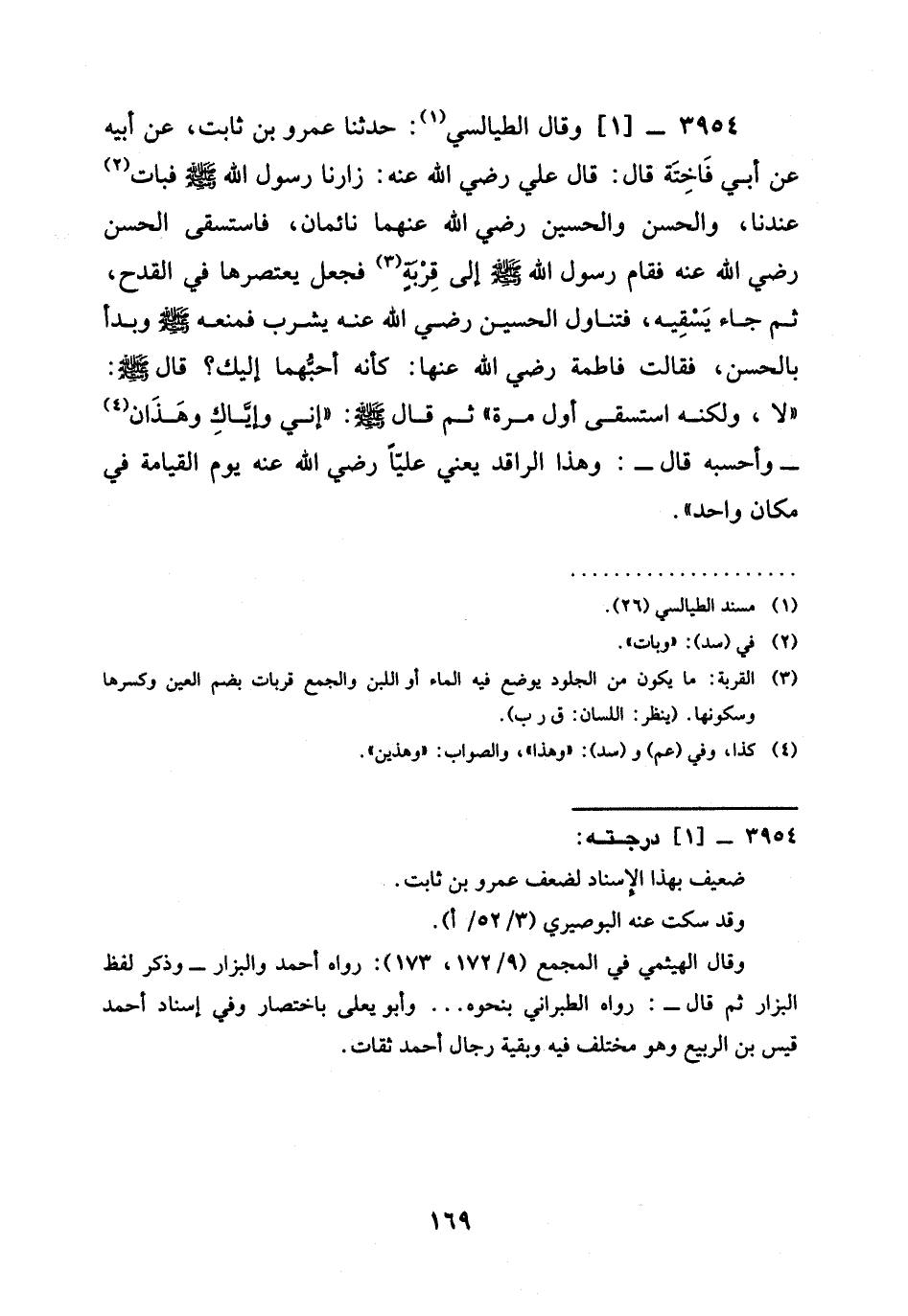 3954 -[1] وَقَالَ الطَّيَالِسِيُّ: حدثنا عَمْرُو بْنُ ثَابِتٍ، عَنْ أَبِيهِ عَنْ أَبِي فَاخِتَةَ قَالَ: قَالَ عَلِيٌّ رَضِيَ الله عَنْه: §زَارَنَا رَسُولُ اللَّهِ صَلَّى اللَّهُ عَلَيْهِ وَسَلَّمَ فَبَاتَ عِنْدَنَا، والحسن والحسين رَضِيَ الله عَنْهما نَائِمَانِ، فَاسْتَسْقَى الْحَسَنُ رَضِيَ الله عَنْه فَقَامَ رَسُولُ اللَّهِ صَلَّى اللَّهُ عَلَيْهِ وَسَلَّمَ إِلَى قِرْبَةٍ فَجَعَلَ يَعْتَصِرُهَا فِي الْقَدَحِ، ثُمَّ جَاءَ يَسْقِيهُ، فَتَنَاوَلَ الْحُسَيْنُ رَضِيَ الله عَنْه يَشْرَبُ فَمَنَعَهُ صَلَّى اللَّهُ عَلَيْهِ وَسَلَّمَ وَبَدَأَ بِالْحَسَنِ، فقالت فاطمة رَضِيَ الله عَنْها: كَأَنَّهُ أَحَبُّهُمَا إِلَيْكَ؟ قَالَ صَلَّى اللَّهُ عَلَيْهِ وَسَلَّمَ: " لَا، وَلَكِنَّهُ اسْتَسْقَى أَوَّلَ مَرَّةٍ " ثُمَّ قَالَ صَلَّى اللَّهُ عَلَيْهِ وَسَلَّمَ: " إِنِّي وَإِيَّاكَ وهذان - وَأَحْسَبُهُ قَالَ -: وَهَذَا الرَّاقِدُ يَعْنِي عَلِيًّا رَضِيَ الله عَنْه يَوْمَ الْقِيَامَةِ فِي مَكَانٍ وَاحِدٍ -[170]- ".