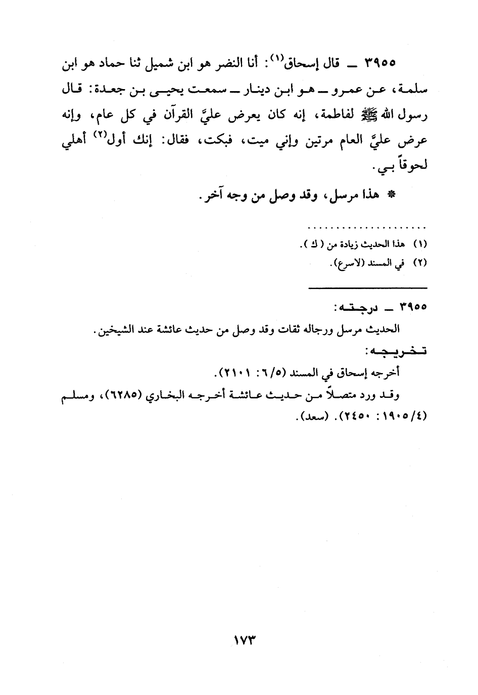 3955 - قَالَ إِسْحَاقُ: أنا النَّضْرُ هُوَ ابْنُ شُمَيْلٍ ثنا حَمَّادٌ هُوَ ابْنُ سَلَمَةَ، عَنْ عَمْرٍو - هُوَ ابْنُ دِينَارٍ - سَمِعْتُ يَحْيَى بْنَ جَعْدَةَ: قَالَ رَسُولُ اللَّهِ صَلَّى اللَّهُ عَلَيْهِ وَسَلَّمَ لِفَاطِمَةَ، إِنَّهُ كَانَ §يُعْرَضُ عَلَيَّ الْقُرْآنُ فِي كُلِّ عَامٍ، وَإِنَّهُ عُرِضَ عَلَيَّ الْعَامَ مَرَّتَيْنٍ وَإِنِّي مَيِّتٌ، فَبَكَتْ، فَقَالَ: إِنَّكِ أَوَّلُ أَهْلِي لُحُوقًا بِي.