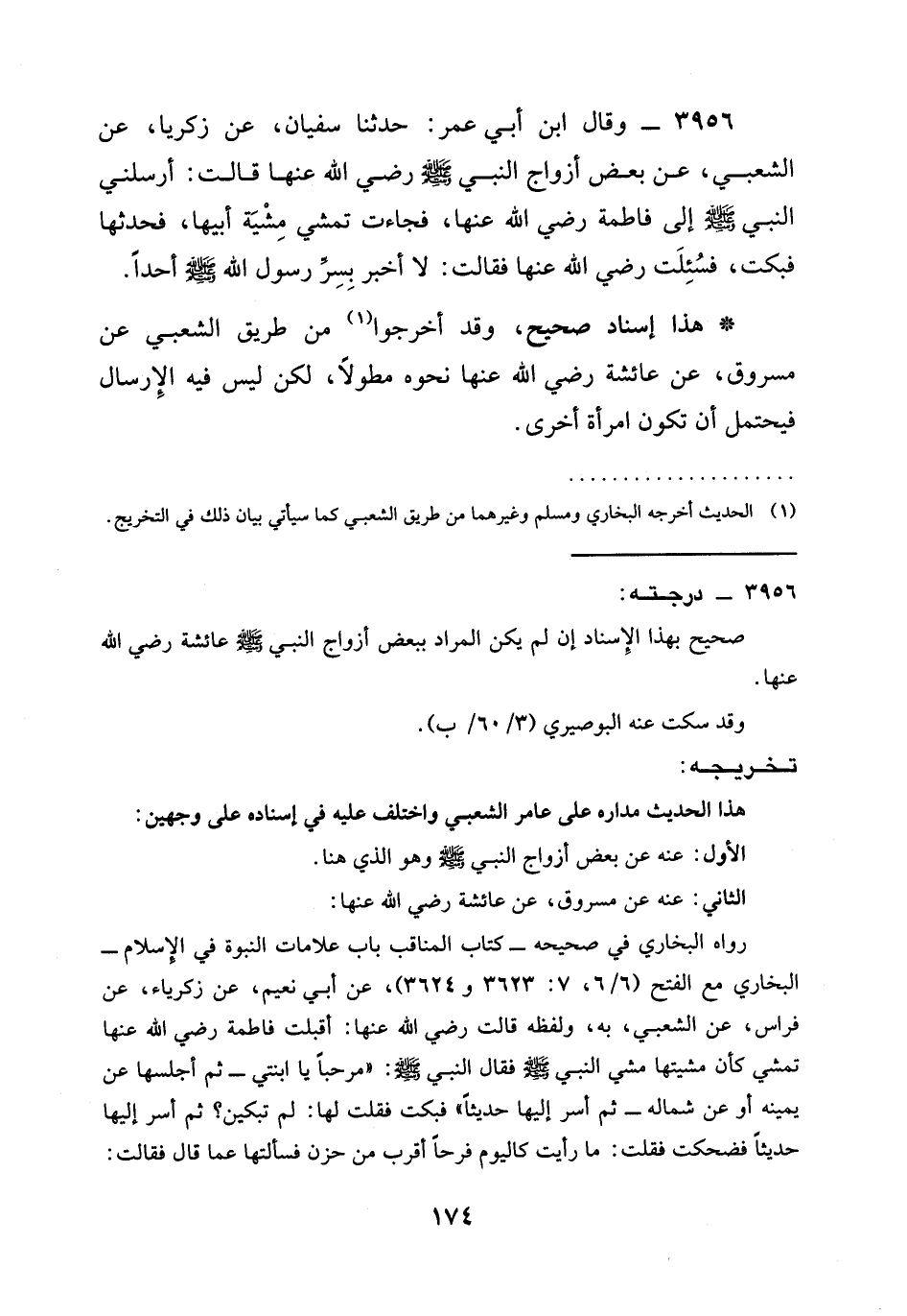 3956 - وَقَالَ ابْنُ أَبِي عُمَرَ: حدثنا سُفْيَانُ، عَنْ زَكَرِيَّا، عَنِ الشَّعْبِيِّ، عَنْ بَعْضِ أزواج النبي صَلَّى اللَّهُ عَلَيْهِ وَسَلَّمَ رَضِيَ الله عَنْها قَالَتْ: أَرْسَلَنِي النَّبِيُّ صَلَّى اللَّهُ عَلَيْهِ وَسَلَّمَ إلى فاطمة رَضِيَ الله عَنْها، فَجَاءَتْ تَمْشِي مِشْيَةَ أَبِيهَا، فَحَدَّثَهَا فبكت، فسئلت رَضِيَ الله عَنْها فَقَالَتْ: §لَا أُخْبِرُ بِسِرِّ رَسُولِ اللَّهِ صَلَّى اللَّهُ عَلَيْهِ وَسَلَّمَ أَحَدًا.