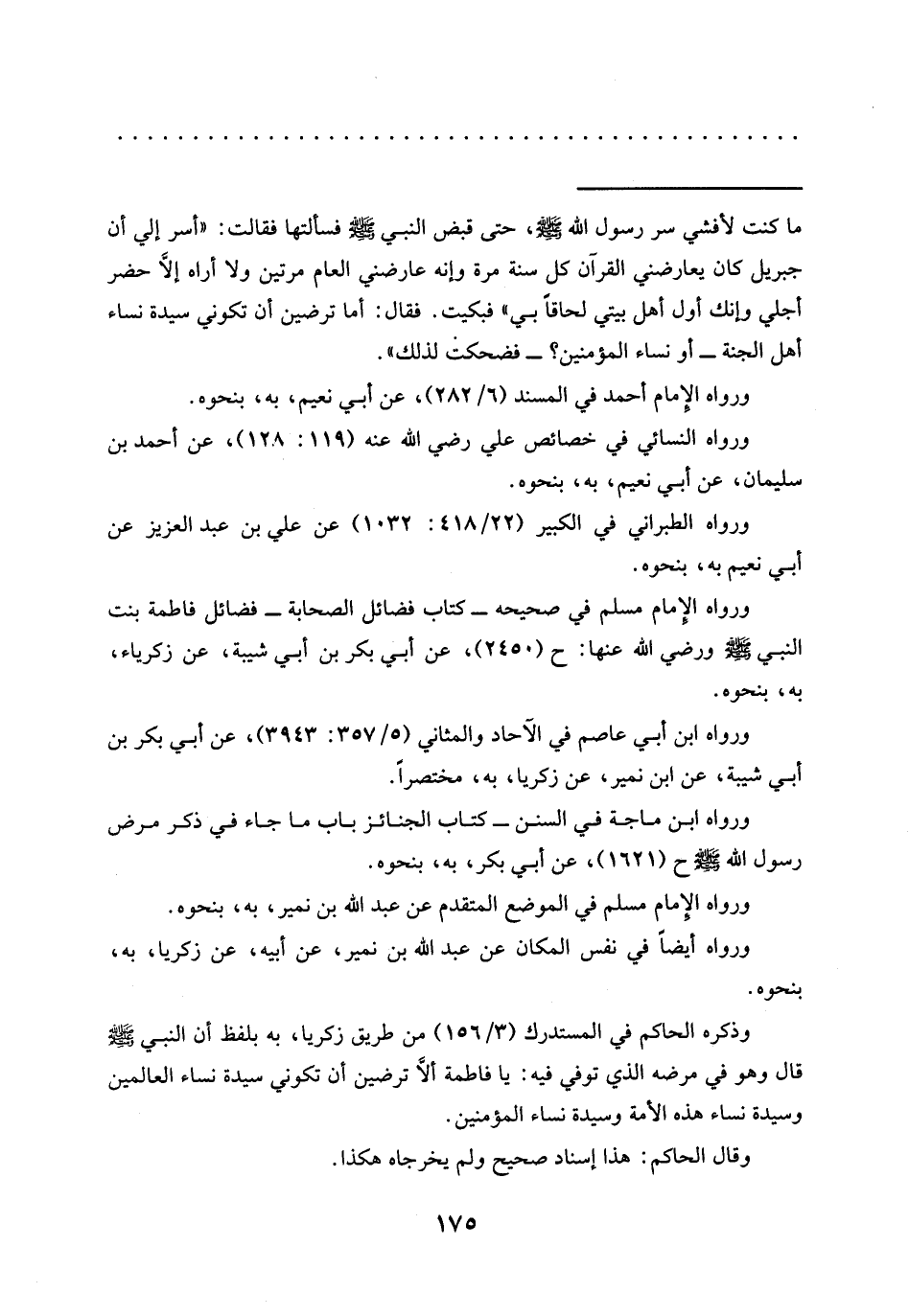 = ما كنت لأفشي سر رسول الله -صلى الله عليه وسلم-، حتى قبض النبي -صلى الله عليه وسلم- فسألتها فقالت: "أسر إلي أن جبريل كان يعارضني القرآن كل سنة مرة وإنه عارضني العام مرتين ولا أراه إلَّا حضر أجلي دهانك أول أهل بيتي لحاقًا بي" فبكيت. فقال: أما ترضين أن تكوني سيدة نساء أهل الجنة -أو نساء المؤمنين؟ - فضحكت لذلك".