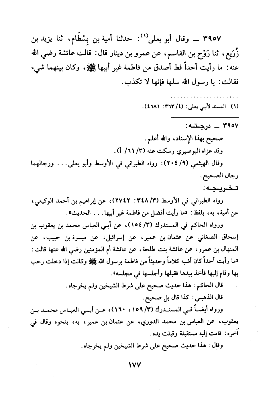 3957 - وَقَالَ أَبُو يَعْلَى: حدثنا أُمَيَّةُ بْنُ بِسْطَامٍ، ثنا يَزِيدُ بْنُ زُرَيْعٍ، ثنا رَوْحُ بْنُ الْقَاسِمِ، عَنْ عَمْرِو بْنِ دِينَارٍ قَالَ: قَالَتْ عَائِشَةُ رَضِيَ الله عَنْه: §مَا رَأَيْتُ أَحَدًا قَطُّ أَصْدَقَ مِنْ فَاطِمَةَ غَيْرَ أَبِيهَا صَلَّى اللَّهُ عَلَيْهِ وَسَلَّمَ، وَكَانَ بَيْنَهُمَا شَيْءٌ فَقَالَتْ: يَا رَسُولَ اللَّهِ سَلْهَا فَإِنَّهَا لَا تَكْذِبُ.
