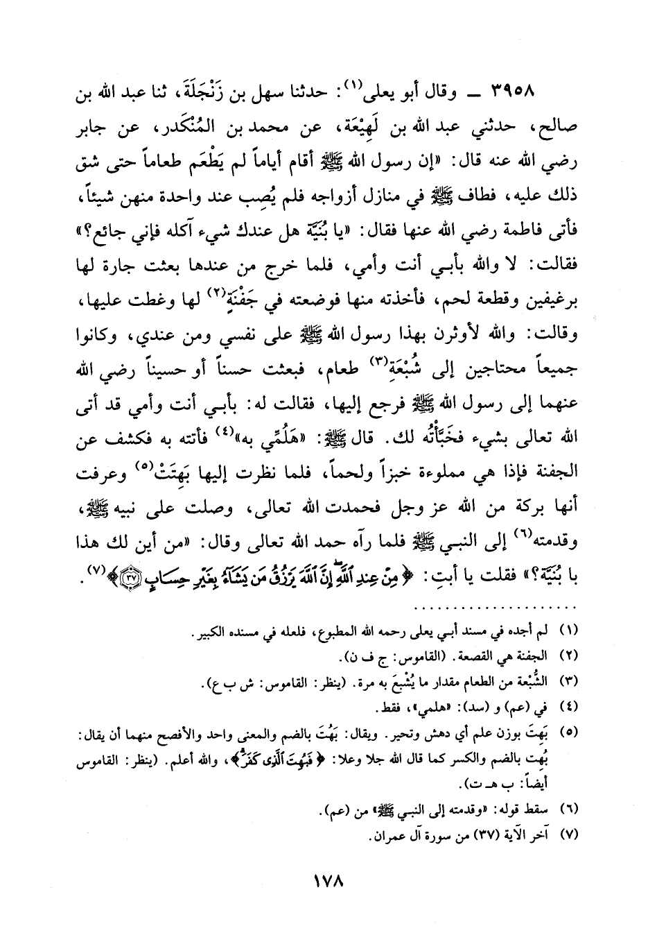3958 - وَقَالَ أَبُو يَعْلَى: حدثنا سَهْلُ بْنُ زَنْجَلَةَ، ثنا عَبْدُ اللَّهِ بْنُ صَالِحٍ، حَدَّثَنِي عَبْدُ اللَّهِ بْنُ لَهِيعَةَ، عَنْ مُحَمَّدِ بْنِ الْمُنْكَدِرِ، عَنْ جَابِرٍ رَضِيَ الله عَنْه قَالَ: " إِنَّ رَسُولَ اللَّهِ صَلَّى اللَّهُ عَلَيْهِ وَسَلَّمَ أَقَامَ أَيَّامًا لَمْ يَطْعَمْ طَعَامًا حَتَّى شَقَّ ذَلِكَ عَلَيْهِ، فَطَافَ صَلَّى اللَّهُ عَلَيْهِ وَسَلَّمَ فِي مَنَازِلِ أَزْوَاجِهِ فَلَمْ يُصِبْ عِنْدَ وَاحِدَةٍ مِنْهُنَّ شَيْئًا، فأتى فاطمة رَضِيَ الله عَنْها فَقَالَ: " يَا بنية §هل عندك شَيْءٌ آكُلُهُ فَإِنِّي جَائِعٌ؟ " فَقَالَتْ: لَا والله بأبي أنت وَأُمِّي، فَلَمَّا خَرَجَ مِنْ عِنْدِهَا بَعَثَتْ جَارَةٌ لَهَا بِرَغِيفَيْنِ وَقِطْعَةِ لَحْمٍ، فَأَخَذَتْهُ مِنْهَا فَوَضَعَتْهُ فِي جَفْنَةٍ لَهَا وَغَطَّتْ عَلَيْهَا، وقالت: وَاللَّهِ لَأُوثِرَنَّ بِهَذَا رَسُولَ اللَّهِ صَلَّى اللَّهُ عَلَيْهِ وَسَلَّمَ عَلَى نَفْسِي وَمَنْ عِنْدِي، وَكَانُوا جَمِيعًا مُحْتَاجِينَ إِلَى شِبْعَةِ طَعَامٍ، فَبَعَثَتْ حَسَنًا أو حسينا رَضِيَ الله عَنْهما إِلَى رَسُولِ اللَّهِ صَلَّى اللَّهُ عَلَيْهِ وَسَلَّمَ فَرَجَعَ إِلَيْهَا، فَقَالَتْ لَهُ: بِأَبِي أَنْتَ وَأُمِّي قَدْ أتى الله تعالى بِشَيْءٍ فَخَبَّأْتُهُ لك. قال صَلَّى اللَّهُ عَلَيْهِ وَسَلَّمَ: " هلمي بِهِ " فأتته به فكشف عَنِ الْجَفْنَةِ فَإِذَا هِيَ مَمْلُوءَةٌ خُبْزًا وَلَحْمًا، فَلَمَّا نَظَرَتْ إِلَيْهَا بُهِتَتْ وَعَرَفَتْ أَنَّهَا بَرَكَةٌ من الله عز وجل فحمدت الله تعالى، وَصَلَّتْ عَلَى نَبِيِّهِ صَلَّى اللَّهُ عَلَيْهِ وَسَلَّمَ، وَقَدَّمَتْهُ إِلَى النَّبِيِّ صَلَّى اللَّهُ عَلَيْهِ وَسَلَّمَ فَلَمَّا رَآهُ حمد الله تعالى وَقَالَ: " مِنْ أَيْنَ لَكِ هَذَا يَا بُنَيَّةُ " فقلت يَا أَبَتِ: {مِنْ عِنْدِ اللَّهِ إِنَّ اللَّهَ يَرْزُقُ مِنْ يَشَاءُ بِغَيْرِ حِسَابٍ -[179]- (37) } .