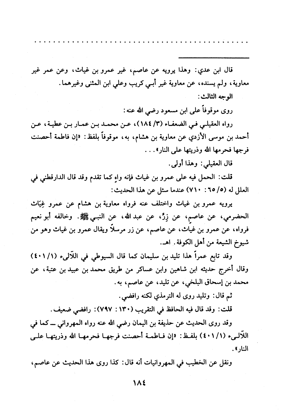 رواه العقيلي في الضعفاء (3/ 184)، عن محمَّد بن عمار بن عطية، عن أحمد بن موسى الأزدي عن معاوية بن هشام، به، موقوفًا بلفظ: "إن فاطمة أحصنت فرجها فحرمها الله وذريتها على النار" ...