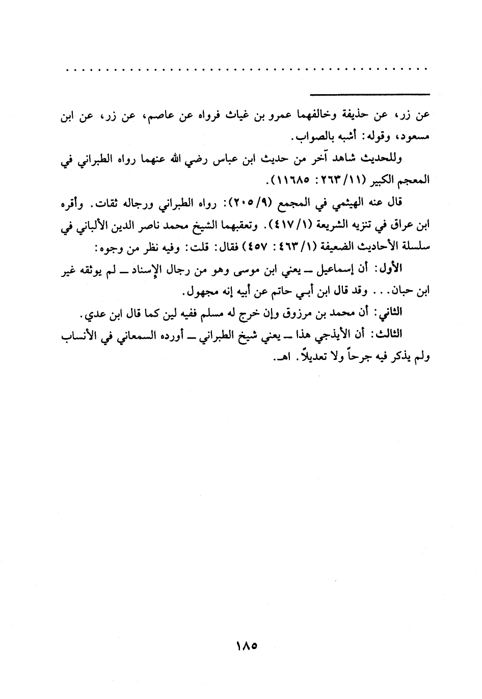 قال عنه الهيثمي في المجمع (9/ 205): رواه الطبراني ورجاله ثقات. وأقره ابن عراق في تنزيه الشريعة (1/ 417). وتعقبهما الشيخ محمَّد ناصر الدين الألباني في سلسلة الأحاديث الضعيفة (1/ 463: 457) فقال: قلت: وفيه نظر من وجوه: