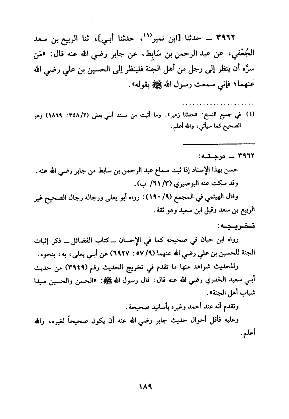 3962 - حَدَّثَنَا [ابْنُ نُمَيْرٍ، حَدَّثَنَا أَبِي] ، ثنا الرَّبِيعُ بْنُ سَعْدٍ الْجُعْفِيُّ، عَنْ عَبْدِ الرَّحْمَنِ بْنِ سَابِطٍ، عَنْ جَابِرٍ رَضِيَ الله عَنْه قَالَ: " §مَنْ سَرَّهُ أَنْ يَنْظُرَ إِلَى رَجُلٍ مِنْ أَهْلِ الْجَنَّةِ فَلْيَنْظُرْ إِلَى الْحُسَيْنِ بْنِ علي رَضِيَ الله عَنْهما؛ فَإِنِّي سَمِعْتُ رَسُولَ اللَّهِ صَلَّى اللَّهُ عَلَيْهِ وَسَلَّمَ يَقُولُهُ ".