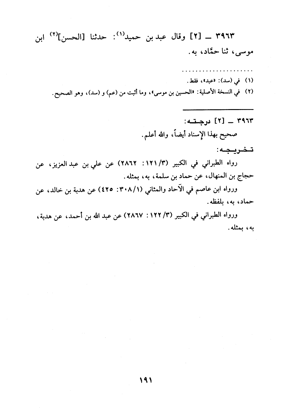 3963 - [2] وَقَالَ عَبْدُ بْنُ حُمَيْدٍ (¬1): حَدَّثَنَا [الحسن] (¬2) ابن موسى، ثنا حمَّاد، به.