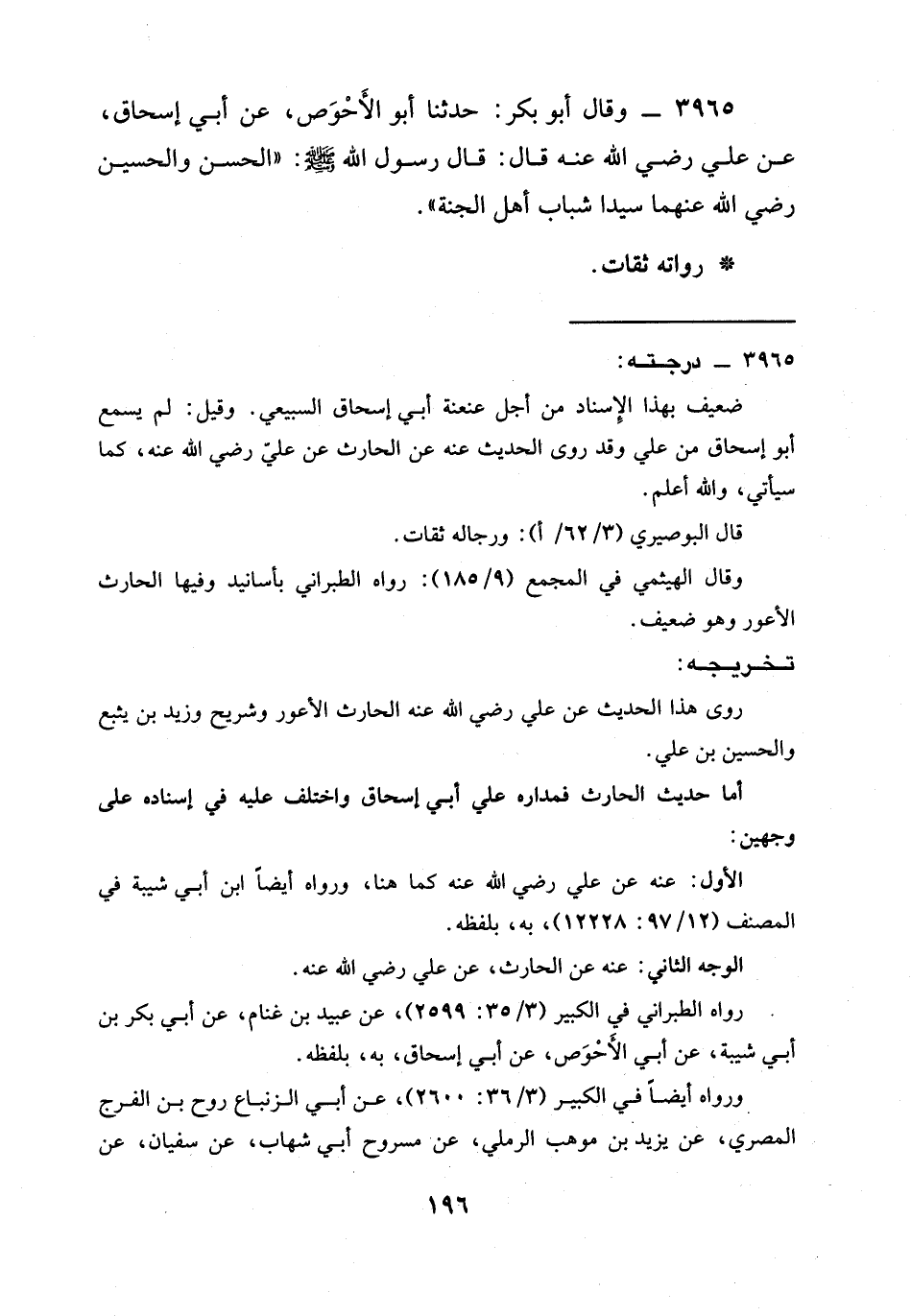 3965 - وَقَالَ أَبُو بَكْرٍ: حدثنا أَبُو الْأَحْوَصِ، عَنْ أَبِي إِسْحَاقَ، عَنْ عَلِيٍّ رَضِيَ الله عَنْه قَالَ: قَالَ رَسُولُ اللَّهِ صَلَّى اللَّهُ عَلَيْهِ وَسَلَّمَ: " §الحسن والحسين رَضِيَ الله عَنْهما سَيِّدَا شَبَابِ أَهْلِ الْجَنَّةِ ".