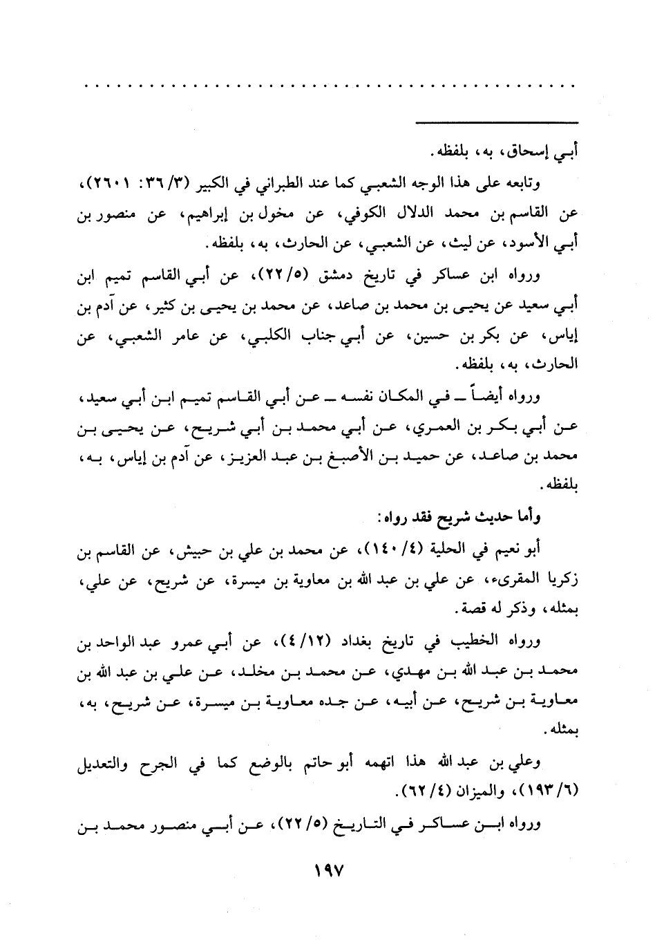 وتابعه على هذا الوجه الشعبي كما عند الطبراني في الكبير (3/ 36: 2601)، عن القاسم بن محمَّد الدلال الكوفي، عن مخول بن إبراهيم، عن منصور بن أبي الأسود، عن ليث، عن الشعبي، عن الحارث، به، بلفظه.