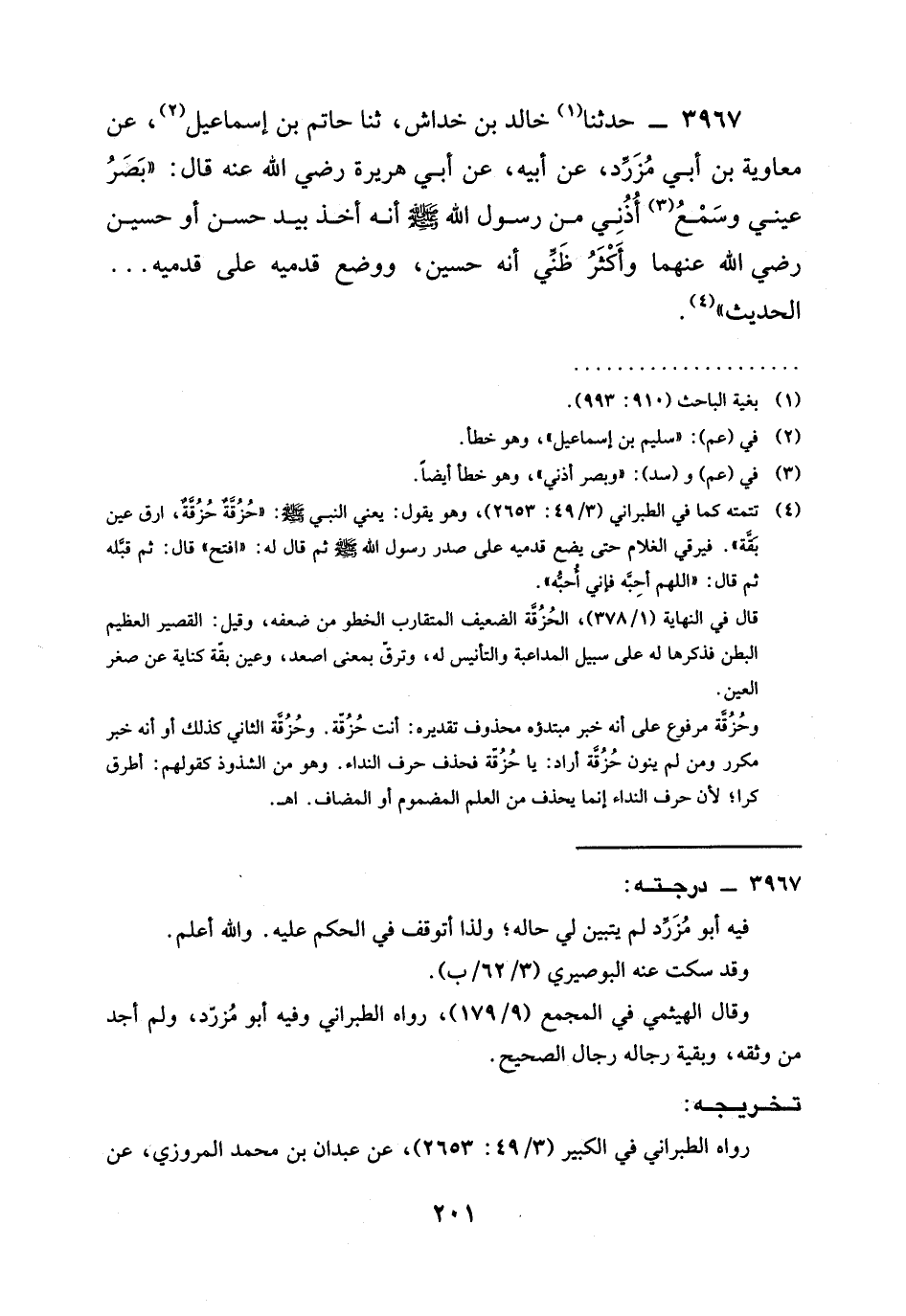 3967 - حدثنا خَالِدُ بْنُ خِدَاشٍ، ثنا حَاتِمُ بْنُ إِسْمَاعِيلَ، عَنْ مُعَاوِيَةَ بْنِ أَبِي مُزَرِّدٍ، عَنْ أَبِيهِ، عَنْ أَبِي هُرَيْرَةَ رَضِيَ الله عَنْه قَالَ: " بَصُرَ عَيْنِي وَسَمِعَ أُذُنِيَ مِنْ رَسُولِ اللَّهِ صَلَّى اللَّهُ عَلَيْهِ وَسَلَّمَ أَنَّهُ §أَخَذَ بِيَدِ حَسَنٍ أو حسين رَضِيَ الله عَنْهما وَأَكْثَرُ ظَنِّي أَنَّهُ حُسَيْنٌ، وَوَضَعَ قَدَمَيْهِ عَلَى قَدَمَيْهِ ... الْحَدِيثَ ".