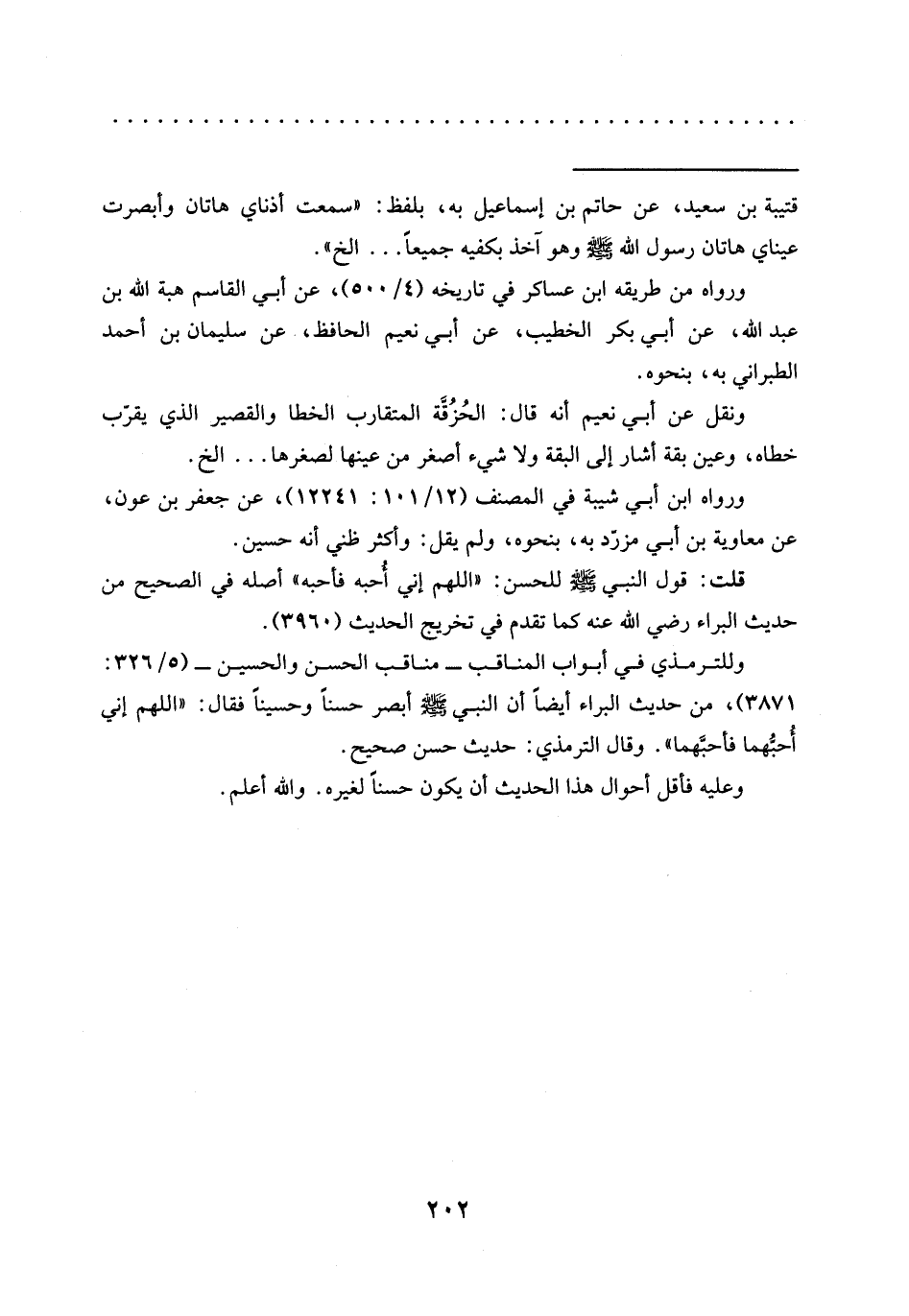 وللترمذي في أبواب المناقب -مناقب الحسن والحسين- (5/ 326: 3871)، من حديث البراء أَيْضًا أَنَّ النَّبِيَّ -صَلَّى اللَّهُ عَلَيْهِ وَسَلَّمَ- أبصر حسنًا وحسينًا فقال: "اللهم إني أُحبُّهما فأَحبُّهما". وقال الترمذي: حديث حسن صحيح.