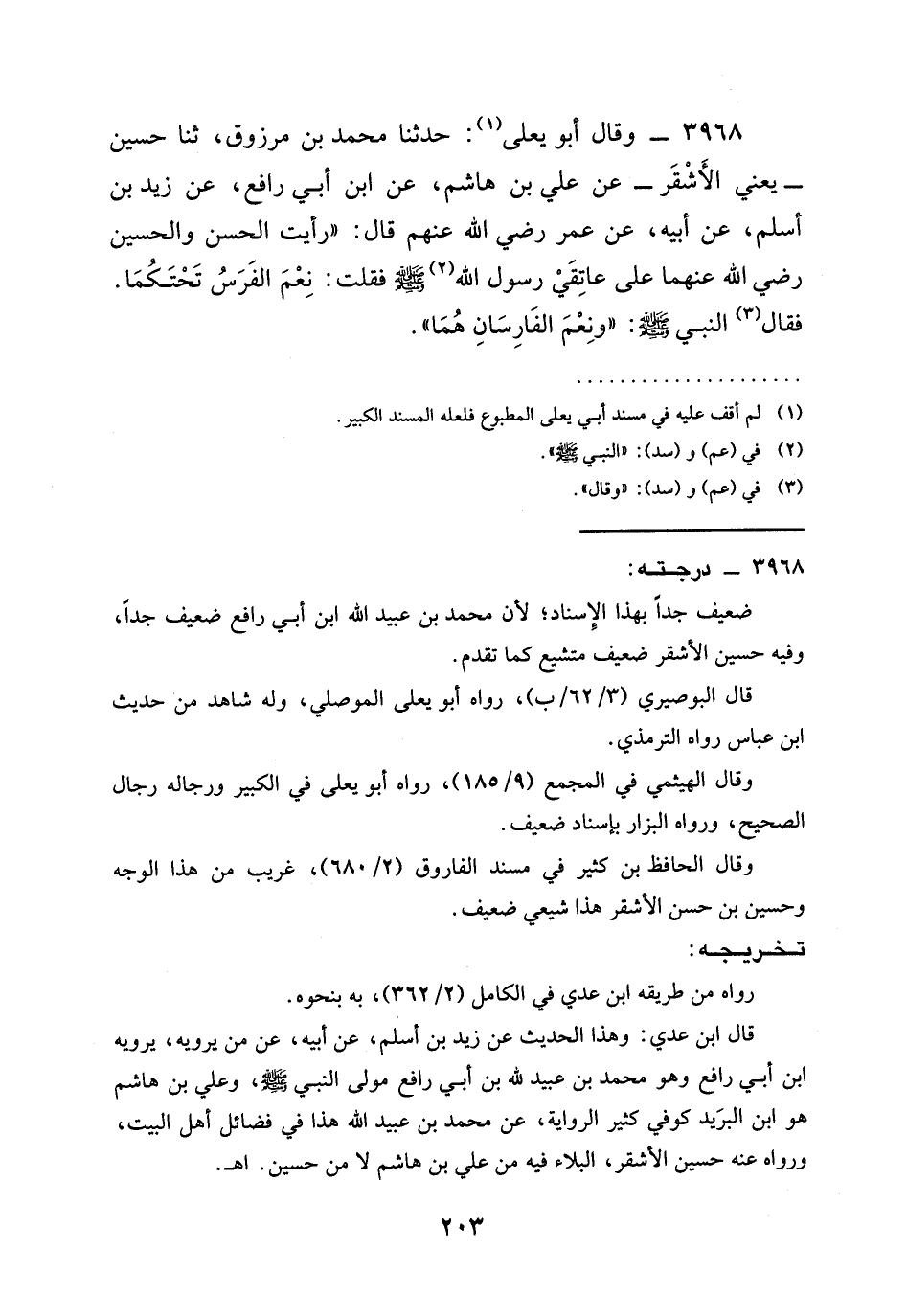 3968 - وَقَالَ أَبُو يَعْلَى: حَدَّثَنَا مُحَمَّدُ بْنُ مَرْزُوقٍ، ثنا حُسَيْنُ - يَعْنِي الْأَشْقَرَ - عَنْ عَلِيِّ بْنِ هَاشِمٍ، عَنِ ابْنِ أَبِي رَافِعٍ، عَنْ زَيْدِ بْنِ أَسْلَمَ، عَنْ أَبِيهِ، عن عمر رَضِيَ الله عَنْهم قَالَ: " §رَأَيْتُ الحسن والحسين رَضِيَ الله عَنْهما على عاتقي رسول الله صَلَّى اللَّهُ عَلَيْهِ وَسَلَّمَ فَقُلْتُ: نِعْمَ الْفَرَسُ تَحْتَكُمَا. فَقَالَ النَّبِيُّ صَلَّى اللَّهُ عَلَيْهِ وَسَلَّمَ: " وَنِعْمَ الْفَارِسَانِ هُمَا ".