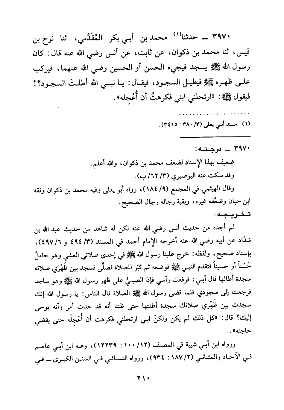 3970 - حدثنا مُحَمَّدُ بْنُ أَبِي بَكْرٍ الْمُقَدَّمِيُّ، ثنا نُوحُ بْنُ قَيْسٍ، ثنا مُحَمَّدُ بْنُ ذَكْوَانَ، عَنْ ثَابِتٍ، عَنْ أَنَسٍ رَضِيَ الله عَنْه قَالَ: كَانَ رَسُولُ الله صَلَّى اللَّهُ عَلَيْهِ وَسَلَّمَ يسجد فيجيء الْحَسَنُ أو الحسين رَضِيَ الله عَنْهما، فيركب على ظَهْرَهُ صَلَّى اللَّهُ عَلَيْهِ وَسَلَّمَ فَيُطِيلُ السُّجُودَ، فَيُقَالُ: يَا نَبِيَّ اللَّهِ أَطَلْتَ السُّجُودَ؟ ! فَيَقُولُ صَلَّى اللَّهُ عَلَيْهِ وَسَلَّمَ: " §ارْتَحَلَنِي ابْنِي فَكَرِهْتُ أَنْ أَعْجَلَهُ ".