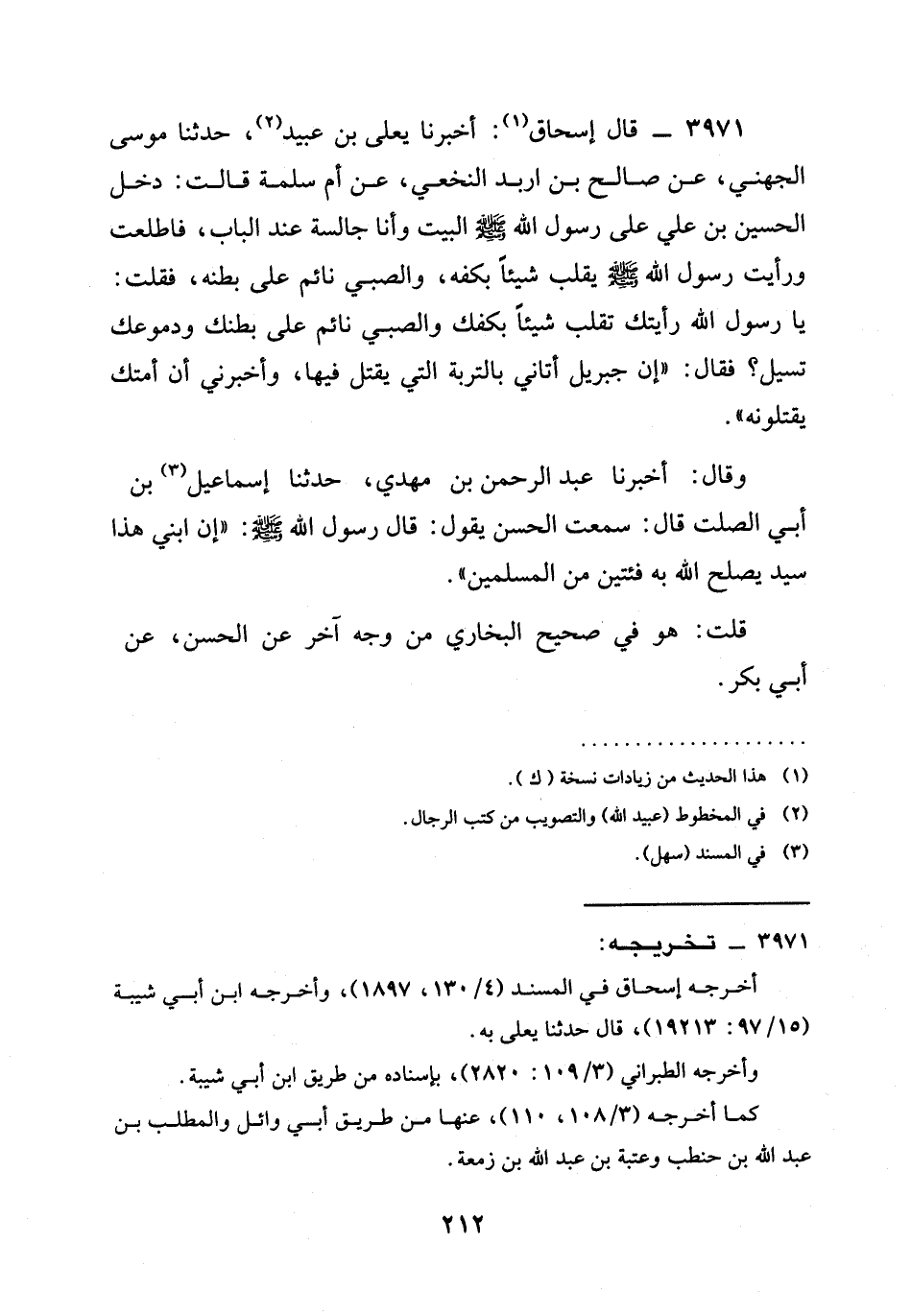 3971 - قَالَ إِسْحَاقُ: أخبرنا يَعْلَى بْنُ عُبَيْدٍ، حدثنا مُوسَى الْجُهَنِيُّ، عَنْ صَالِحِ بْنِ أَرْبَدَ النَّخَعِيِّ، عَنْ أُمِّ سَلَمَةَ قَالَتْ: دَخَلَ الْحُسَيْنُ بْنُ عَلِيٍّ عَلَى رَسُولِ اللَّهِ صَلَّى اللَّهُ عَلَيْهِ وَسَلَّمَ الْبَيْتَ وَأَنَا جَالِسَةٌ عِنْدَ الْبَابِ، فَاطَّلَعْتُ ورأيت رَسُولَ اللَّهِ صَلَّى اللَّهُ عَلَيْهِ وَسَلَّمَ يُقَلِّبُ شَيْئًا بِكَفِّهِ، وَالصَّبِيُّ نَائِمٌ عَلَى بَطْنِهِ، فَقُلْتُ: يَا رَسُولَ اللَّهِ رَأَيْتُكَ تُقَلِّبُ شَيْئًا بِكَفِّكَ وَالصَّبِيُّ نَائِمٌ عَلَى بَطْنِكَ وَدُمُوعُكَ تَسِيلُ؟ فَقَالَ: " إِنَّ §جِبْرِيلَ أَتَانِي بِالتُّرْبَةِ الَّتِي يُقْتَلُ فِيهَا، وَأَخْبَرَنِي أَنَّ أُمَّتَكَ يَقْتُلُونَهُ ".