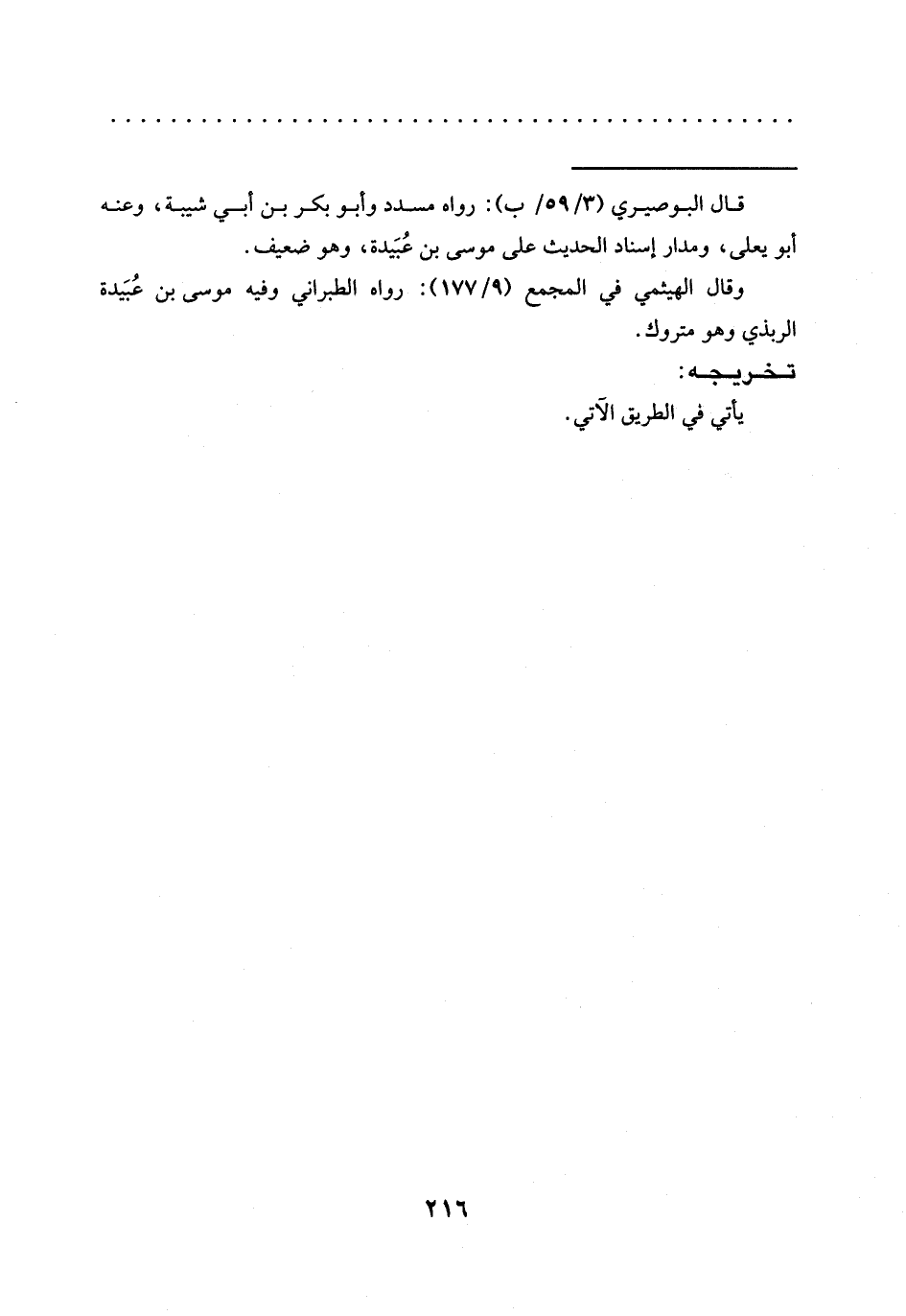 = قال البوصيري (3/ 59/ب): رواه مسدّد وأبو بكر بن أبي شيبة، وعنه أبو يعلى، ومدار إسناد الحديث على موسى بن عُبَيدة، وهو ضعيف.