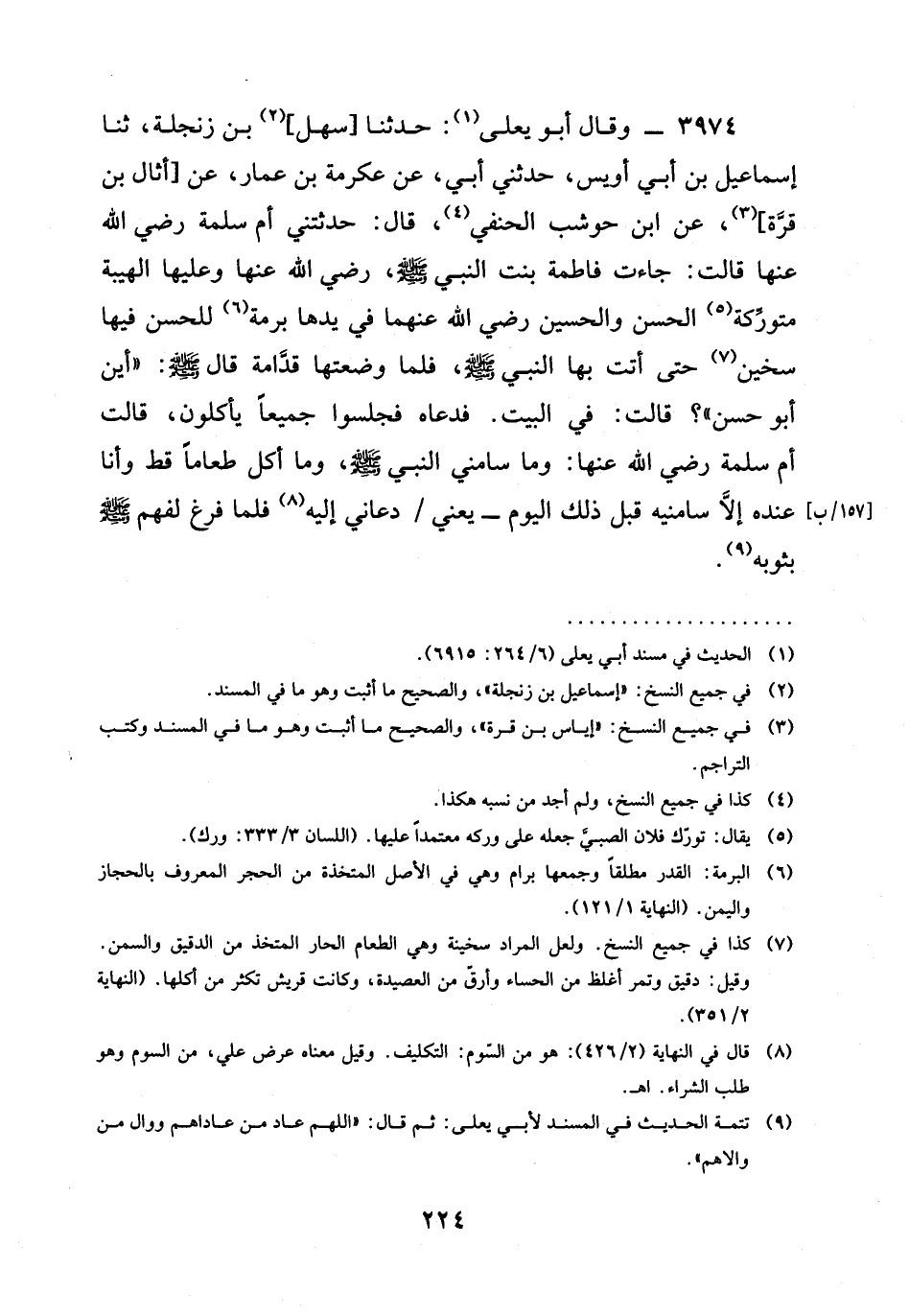 3974 - وَقَالَ أَبُو يَعْلَى: حَدَّثَنَا [سَهْلُ] بْنُ زَنْجَلَةَ، ثنا إِسْمَاعِيلُ بْنُ أَبِي أُوَيْسٍ، حَدَّثَنِي أَبِي، عَنْ عِكْرِمَةَ بْنِ عَمَّارٍ، عَنْ [أُثَالِ بْنِ قُرَّةَ] ، عَنِ ابْنِ حَوْشَبٍ الْحَنَفِيِّ، قَالَ: حَدَّثَتْنِي أُمُّ سَلَمَةَ رَضِيَ الله عَنْها قَالَتْ: جَاءَتْ فَاطِمَةُ بِنْتُ النَّبِيِّ صَلَّى اللَّهُ عَلَيْهِ وَسَلَّمَ، رَضِيَ الله عَنْها وَعَلَيْهَا الْهَيْبَةُ مُتَوَرِّكَةً الْحَسَنَ وَالْحُسَيْنَ رَضِيَ الله عَنْهما فِي يَدِهَا بُرْمَةٌ لِلْحَسَنِ فِيهَا سَخِينٌ حَتَّى أَتَتْ بِهَا النَّبِيَّ صَلَّى اللَّهُ عَلَيْهِ وَسَلَّمَ، فَلَمَّا وَضَعَتْهَا قُدَّامَهُ قَالَ صَلَّى اللَّهُ عَلَيْهِ وَسَلَّمَ: " §أَيْنَ أَبُو حَسَنٍ "؟ قَالَتْ: فِي الْبَيْتِ. فَدَعَاهُ فَجَلَسُوا جَمِيعًا يَأْكُلُونَ، قَالَتْ أم سلمة رَضِيَ الله عَنْها: وَمَا سَامَنِي النَّبِيُّ صَلَّى اللَّهُ عَلَيْهِ وَسَلَّمَ، وَمَا أَكَلَ طَعَامًا قَطُّ وَأَنَا عِنْدَهُ إِلَّا سَامَنِيهِ قَبْلَ ذَلِكَ الْيَوْمِ - يعني / دَعَانِي إِلَيْهِ فَلَمَّا فَرَغَ لَفَّهُمْ صَلَّى اللَّهُ عَلَيْهِ وَسَلَّمَ بِثَوْبِهِ.
