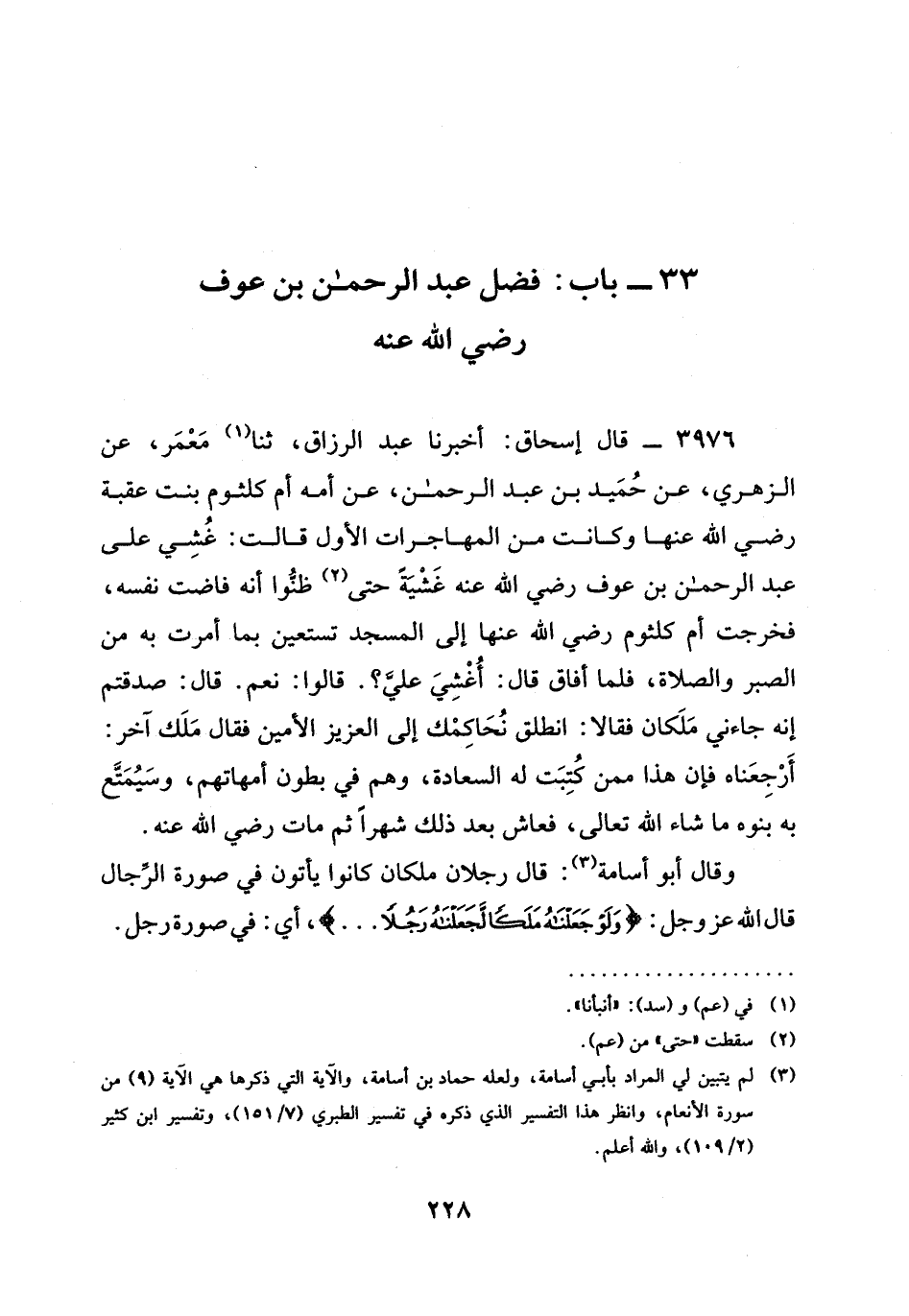 3976 - قال إسحاق: أخبرنا عبد الرزاق، ثنا مَعْمَرٌ، عَنِ الزُّهْرِيِّ، عَنْ حُمَيْدِ بْنِ عَبْدِ الرَّحْمَنِ، عَنْ أُمِّهِ أُمِّ كُلْثُومٍ بنت عقبة رَضِيَ الله عَنْها وَكَانَتْ مِنَ المهاجرات الْأُوَّلِ قَالَتْ: غُشِيَ عَلَى عَبْدِ الرَّحْمَنِ بْنِ عَوْفٍ رَضِيَ الله عَنْه غَشْيَةً حَتَّى ظَنُّوا أَنَّهُ فَاضَتْ نَفْسُهُ، فَخَرَجَتْ أم كلثوم رَضِيَ الله عَنْها إِلَى الْمَسْجِدِ تَسْتَعِينُ بِمَا أُمِرَتْ بِهِ مِنَ الصَّبْرِ وَالصَّلَاةِ، فَلَمَّا أَفَاقَ قَالَ: §أَغُشِيَ عَلَيَّ؟ . قَالُوا: نَعَمْ. قَالَ: صَدَقْتُمْ إِنَّهُ جَاءَنِي مَلَكَانِ فَقَالَا: انْطَلِقْ نُحَاكِمْكَ إِلَى الْعَزِيزِ الْأَمِينِ فَقَالَ مَلَكٌ آخَرُ: أرجعناه فَإِنَّ هذا ممن كتبت له السَّعَادَةُ، وَهُمْ فِي بُطُونِ أُمَّهَاتِهِمْ، وَسَيُمَتَّعُ بِهِ بَنُوهُ مَا شَاءَ الله تعالى، فَعَاشَ بَعْدَ ذَلِكَ شَهْرًا ثُمَّ مَاتَ رَضِيَ الله عَنْه.