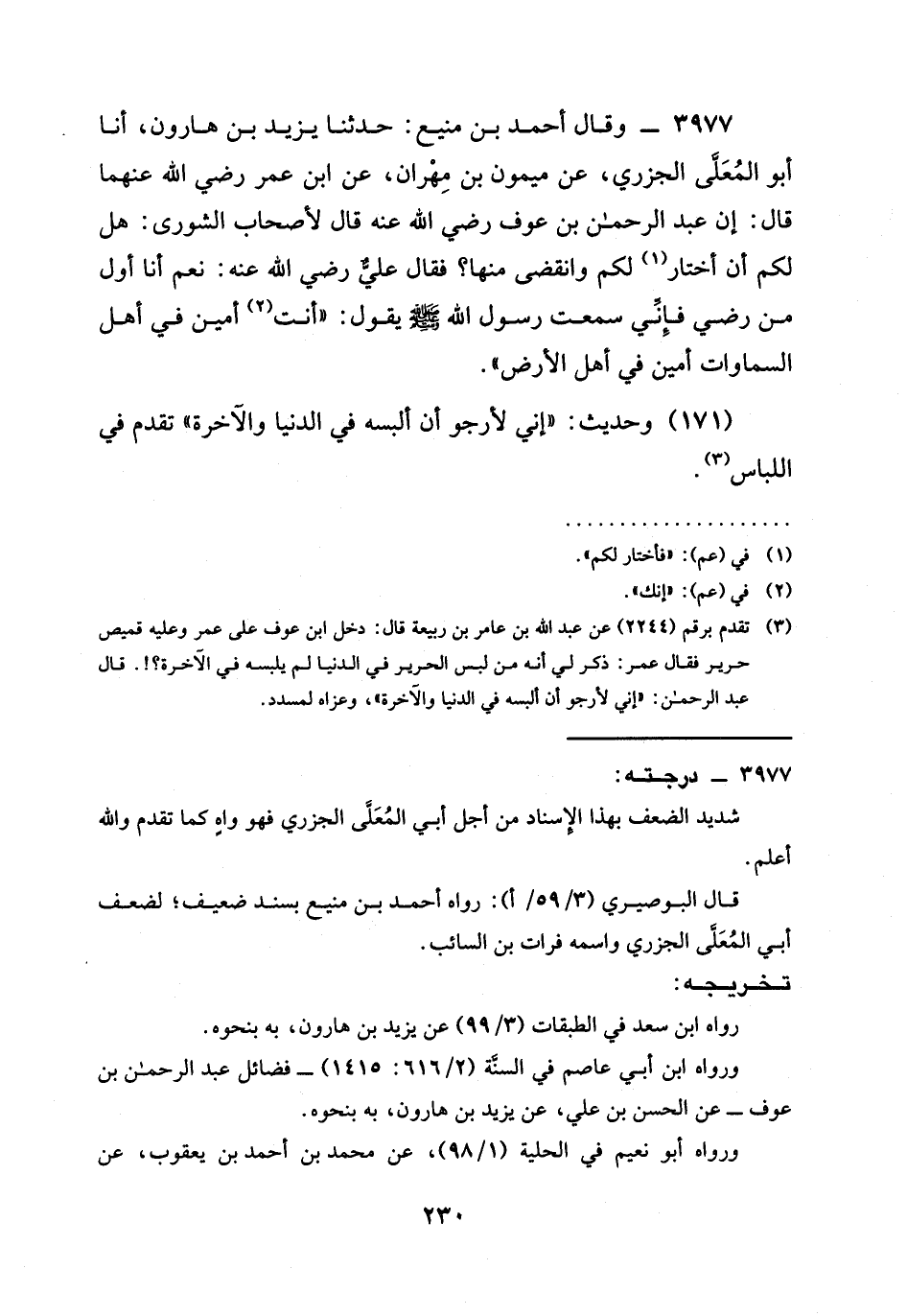 3977 - وَقَالَ أَحْمَدُ بْنُ مَنِيعٍ: حدثنا يَزِيدُ بْنُ هَارُونَ، أنا أَبُو الْمُعَلَّى الْجَزَرِيُّ، عَنْ مَيْمُونِ بْنِ مِهْرَانَ، عَنِ ابن عمر رَضِيَ الله عَنْهما قَالَ: إِنَّ عَبْدَ الرَّحْمَنِ بْنَ عَوْفٍ رَضِيَ الله عَنْه قَالَ لِأَصْحَابِ الشُّورَى: هَلْ لَكُمْ أَنْ أختار لكم وانقضى منها؟ فَقَالَ عَلِيٌّ رَضِيَ الله عَنْه: نَعَمْ أَنَا أَوَّلُ مَنْ رَضِيَ فَإِنِّي سَمِعْتُ رَسُولَ اللَّهِ صَلَّى اللَّهُ عَلَيْهِ وَسَلَّمَ يَقُولُ: " §أَنْتَ أَمِينٌ فِي أَهْلِ السَّمَاوَاتِ أَمِينٌ فِي أَهْلِ الْأَرْضِ ".