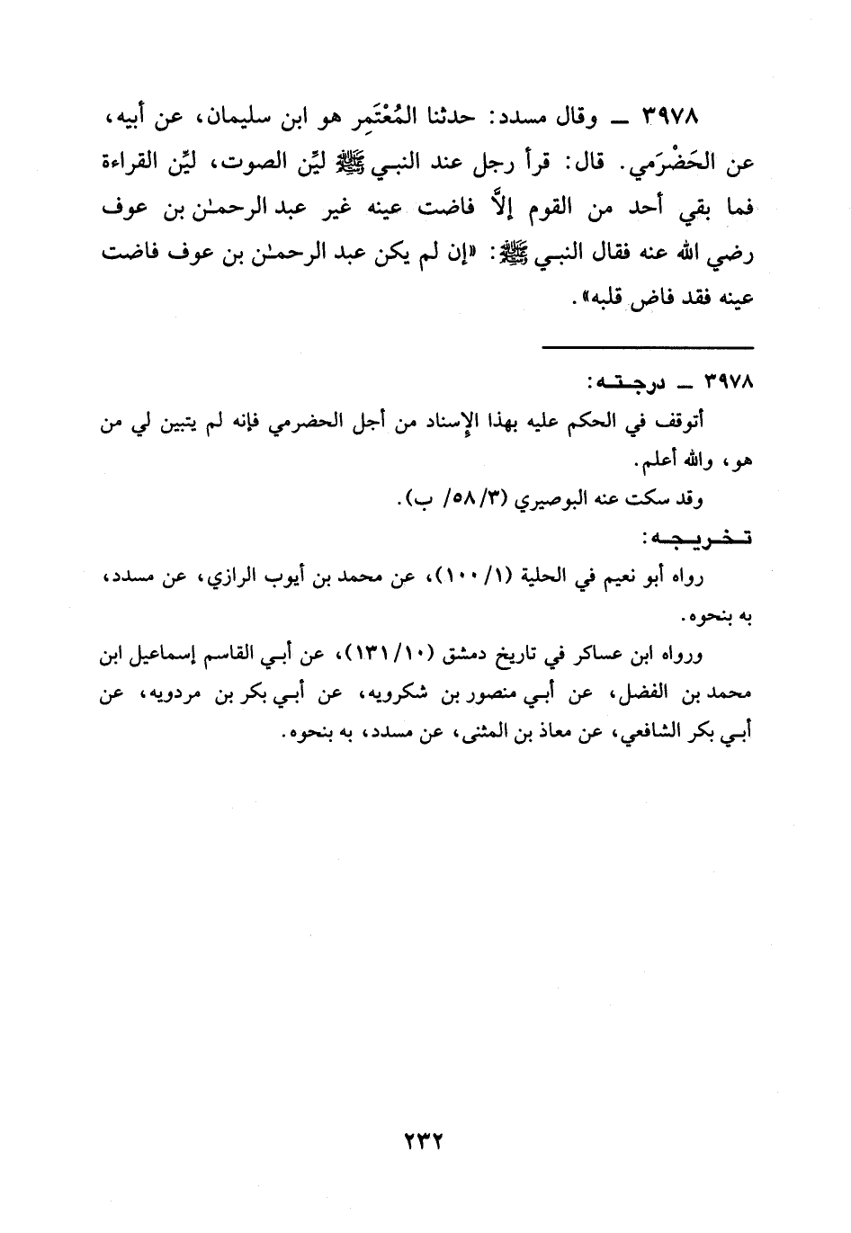 3978 - وَقَالَ مُسَدَّدٌ: حدثنا الْمُعْتَمِرُ هُوَ ابْنُ سُلَيْمَانَ، عَنْ أَبِيهِ، عَنِ الْحَضْرَمِيِّ. قَالَ: قَرَأَ رَجُلٌ عِنْدَ النَّبِيِّ صَلَّى اللَّهُ عَلَيْهِ وَسَلَّمَ لَيِّنُ الصَّوْتِ، لَيِّنُ الْقِرَاءَةِ فَمَا بَقِيَ أَحَدٌ مِنَ الْقَوْمِ إِلَّا فَاضَتْ عَيْنُهُ غَيْرَ عَبْدِ الرَّحْمَنِ بْنِ عوف رَضِيَ الله عَنْه فقال النبي صَلَّى اللَّهُ عَلَيْهِ وَسَلَّمَ: " §إِنْ لَمْ يَكُنْ عَبْدُ الرحمن بن عوف فَاضَتْ عَيْنُهُ فَقَدْ فَاضَ قَلْبُهُ ".
