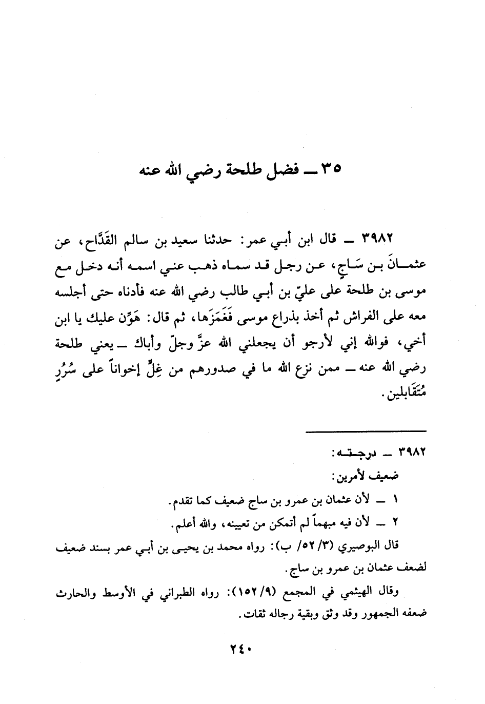 3982 - قَالَ ابْنُ أَبِي عُمَرَ: حدثنا سَعِيدُ بْنُ سَالِمٍ الْقِدَاحُ، عَنْ عُثْمَانَ بْنِ سَاجٍ، عَنْ رَجُلٍ قَدْ سَمَّاهُ ذَهَبَ عَنِّي اسْمُهُ أَنَّهُ دَخَلَ مَعَ مُوسَى بْنِ طَلْحَةَ عَلَى عَلِيِّ بْنِ أَبِي طَالِبٍ رَضِيَ الله عَنْه فَأَدْنَاهُ حَتَّى أَجْلَسَهُ مَعَهُ عَلَى الْفِرَاشِ ثُمَّ أَخَذَ بِذِرَاعِ مُوسَى فَغَمَزَهَا، ثُمَّ قَالَ: §هَوِّنْ عَلَيْكَ يَا ابن أخي، فوالله إِنِّي لَأَرْجُو أَنْ يَجْعَلَنِي اللَّهُ عَزَّ وَجَلَّ وَأَبَاكَ - يَعْنِي طَلْحَةَ رَضِيَ الله عَنْه - مِمَّنْ نَزَعَ اللَّهُ مَا فِي صُدُورِهِمْ مِنْ غَلٍّ إِخْوَانًا عَلَى سُرَرٍ مُتَقَابِلِينَ.