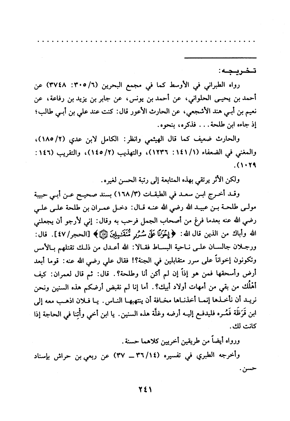 وقد أخرج ابن سعد في الطبقات (3/ 168) بسند صحيح عن أبي حبيبة مولى طلحة بن عبيد الله رضي الله عنه قال: دخل عمران بن طلحة على علي رضي الله عنه بعد ما فرغ من أصحاب الجمل فرحب به وقال: إني لأرجو أن يجعلني الله وأباك من الذين قال الله: {إِخْوَانًا عَلَى سُرُرٍ مُتَقَابِلِينَ} [الحجر: 47]. قال: ورجلان جالسان على ناحية البساط فقالا: الله أعدل من ذلك تقتلهم بالأمس وتكونون إخوانًا على سرر متقابلين في الجنة؟! فقال علي رضي الله عنه: قوما أبعد أرض وأسحقها فمن هو إذًا إن لم أكن أنا وطلحة؟. قال: ثم قال لعمران: كيف أهْلُك من بقي من أمهات أولاد أبيك؟. أما إنا لم نقبض أرضكم هذه السنين ونحن نريد أن ناخذها إنما أخذناها مخافة أن ينتهبها الناس. يا فلان اذهب معه إلى ابن قَرَظَة فَمُره فليدفع إليه أرضه وغلَّة هذه السنين. يا ابن أخي وأْتِنا في الحاجة إذا كانت لك.