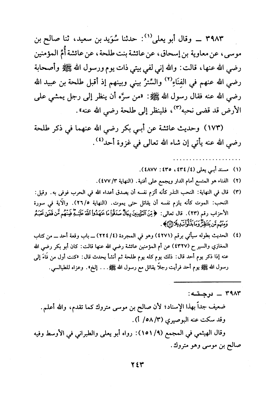 3983 - وَقَالَ أَبُو يَعْلَى: حدثنا سُوَيْدُ بْنُ سَعِيدٍ، ثنا صَالِحُ بْنُ مُوسَى، عَنْ مُعَاوِيَةَ بْنِ إِسْحَاقَ، عَنْ عَائِشَةَ بِنْتِ طَلْحَةَ، عَنْ عَائِشَةَ أم المؤمنين رَضِيَ الله عَنْها، قَالَتْ: وَاللَّهِ إِنِّي لَفِي بَيْتِي ذَاتَ يَوْمٍ وَرَسُولُ الله صَلَّى اللَّهُ عَلَيْهِ وَسَلَّمَ وأصحابه رَضِيَ الله عَنْهم فِي الْفِنَاءِ وَالسِّتْرُ بَيْنِي وَبَيْنَهُمْ إِذْ أَقْبَلَ طَلْحَةُ بْنُ عُبَيْدِ اللَّهِ رَضِيَ الله عَنْه فَقَالَ رَسُولُ اللَّهِ صَلَّى اللَّهُ عَلَيْهِ وَسَلَّمَ: " §مَنْ سَرَّهُ أَنْ يَنْظُرَ إِلَى رَجُلٍ يَمْشِي عَلَى الْأَرْضِ قَدْ قَضَى نَحْبَهُ، فَلْيَنْظُرْ إِلَى طَلْحَةَ رَضِيَ الله عَنْه ".