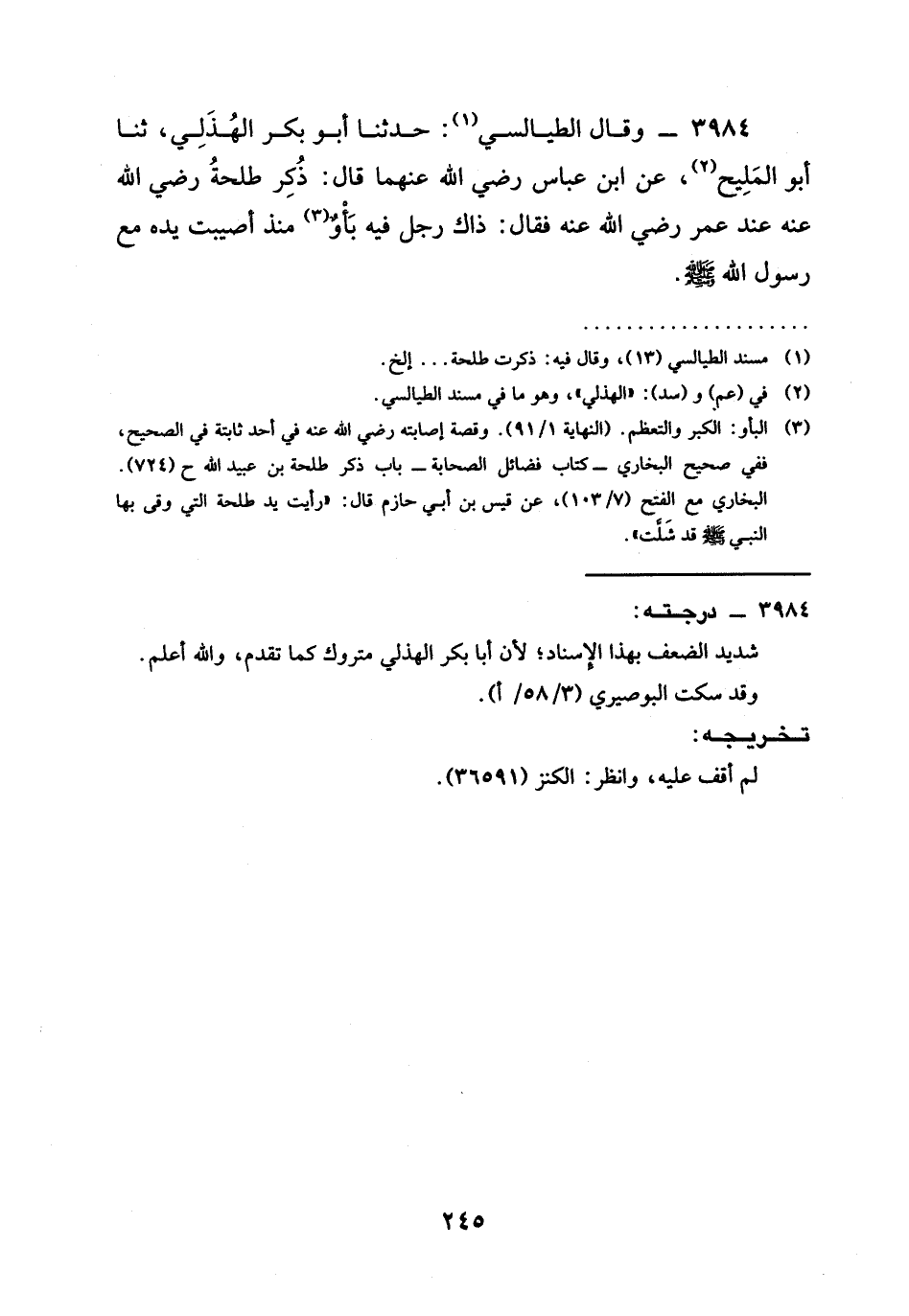 3984 - وقال الطيالسي: حدثنا أَبُو بَكْرٍ الْهُذَلِيُّ، ثنا أَبُو الْمَلِيحِ، عَنِ ابن عباس رَضِيَ الله عَنْهما قَالَ: ذُكِرَ طَلْحَةُ رَضِيَ الله عَنْه عِنْدَ عُمَرَ رَضِيَ الله عَنْه فَقَالَ: §ذَاكَ رَجُلٌ فِيهِ بَأْوٌ مُنْذُ أُصِيبَتْ يَدَهُ مَعَ رَسُولِ اللَّهِ صَلَّى اللَّهُ عَلَيْهِ وَسَلَّمَ.