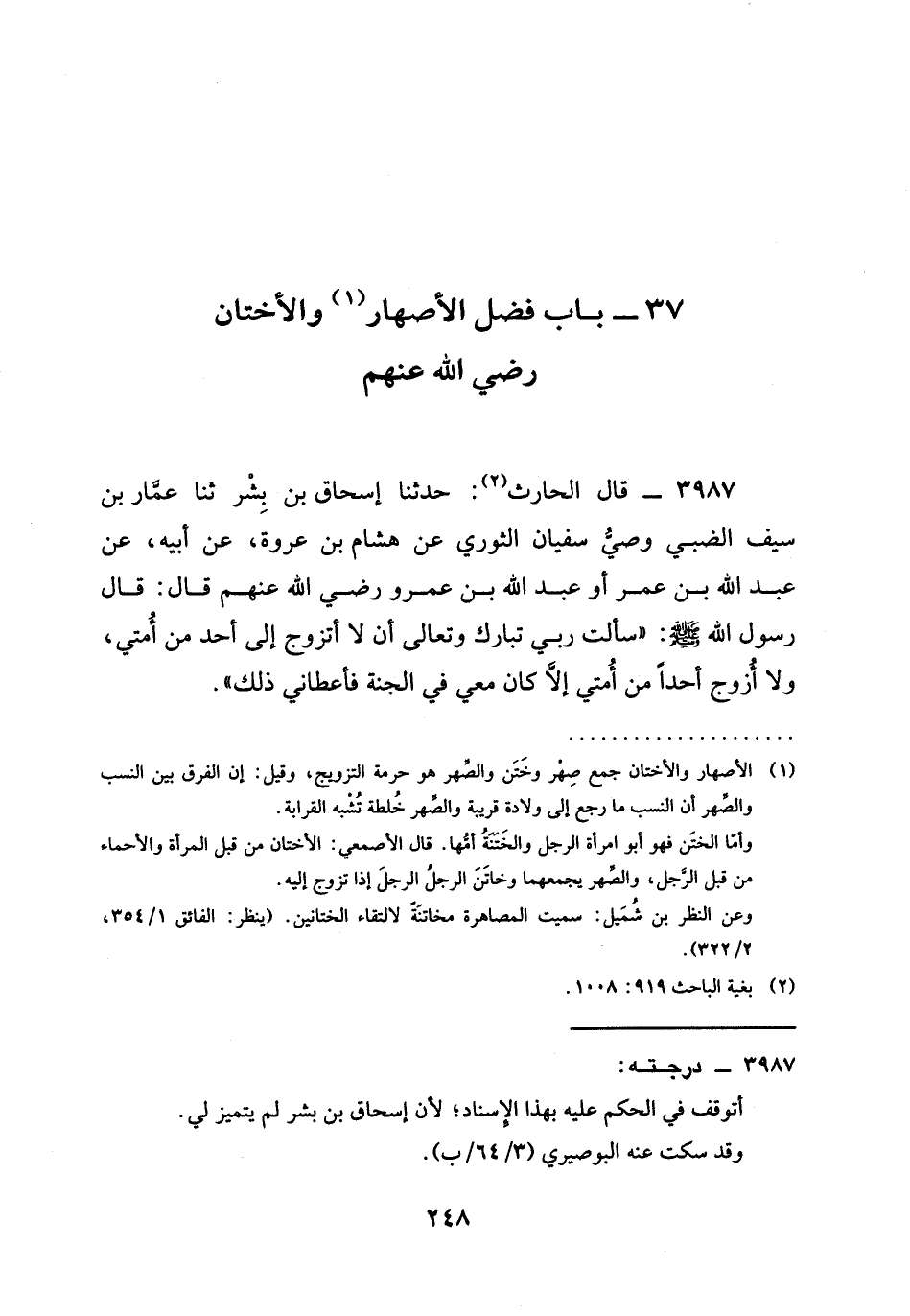 3987 - قَالَ الْحَارِثُ: حدثنا إِسْحَاقُ بْنُ بِشْرٍ ثنا عمار بن سيف الضَّبِّيُّ وَصِيُّ سُفْيَانَ الثَّوْرِيِّ عَنْ هِشَامِ بْنِ عُرْوَةَ، عَنْ أَبِيهِ، عَنْ عَبْدِ اللَّهِ بْنِ عمر أو عبد الله بن عمرو رَضِيَ الله عَنْهم قَالَ: قَالَ رَسُولُ اللَّهِ صَلَّى اللَّهُ عَلَيْهِ وَسَلَّمَ: " §سألت ربي تبارك وتعالى أَنْ لَا أَتَزَوَّجَ إِلَى أَحَدٍ مِنْ أُمَّتِي، وَلَا أُزَوِّجُ أَحَدًا مِنْ أُمَّتِي إِلَّا كَانَ مَعِي فِي الْجَنَّةِ فَأَعْطَانِي ذَلِكَ ".
