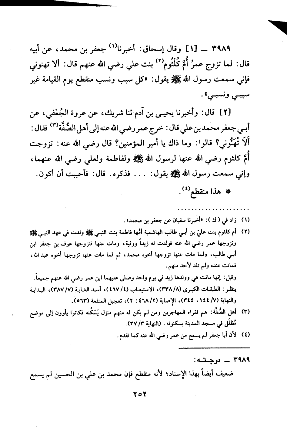 3989 -[1] وَقَالَ إِسْحَاقُ: أخبرنا جَعْفَر بْن مُحَمَّدٍ، عَنْ أَبِيهِ قَالَ: لَمَّا تَزَوَّجَ عُمَرُ أُمَّ كُلْثُومٍ بنت علي رَضِيَ الله عَنْهم قَالَ: أَلَا تهنوني فَإِنِّي سَمِعْتُ رَسُولَ اللَّهِ صَلَّى اللَّهُ عَلَيْهِ وَسَلَّمَ يَقُولُ: " §كُلُّ سَبَبٍ وَنَسَبٍ مُنْقَطِعٌ يَوْمَ الْقِيَامَةِ غَيْرَ سَبَبِي ونسبي ".