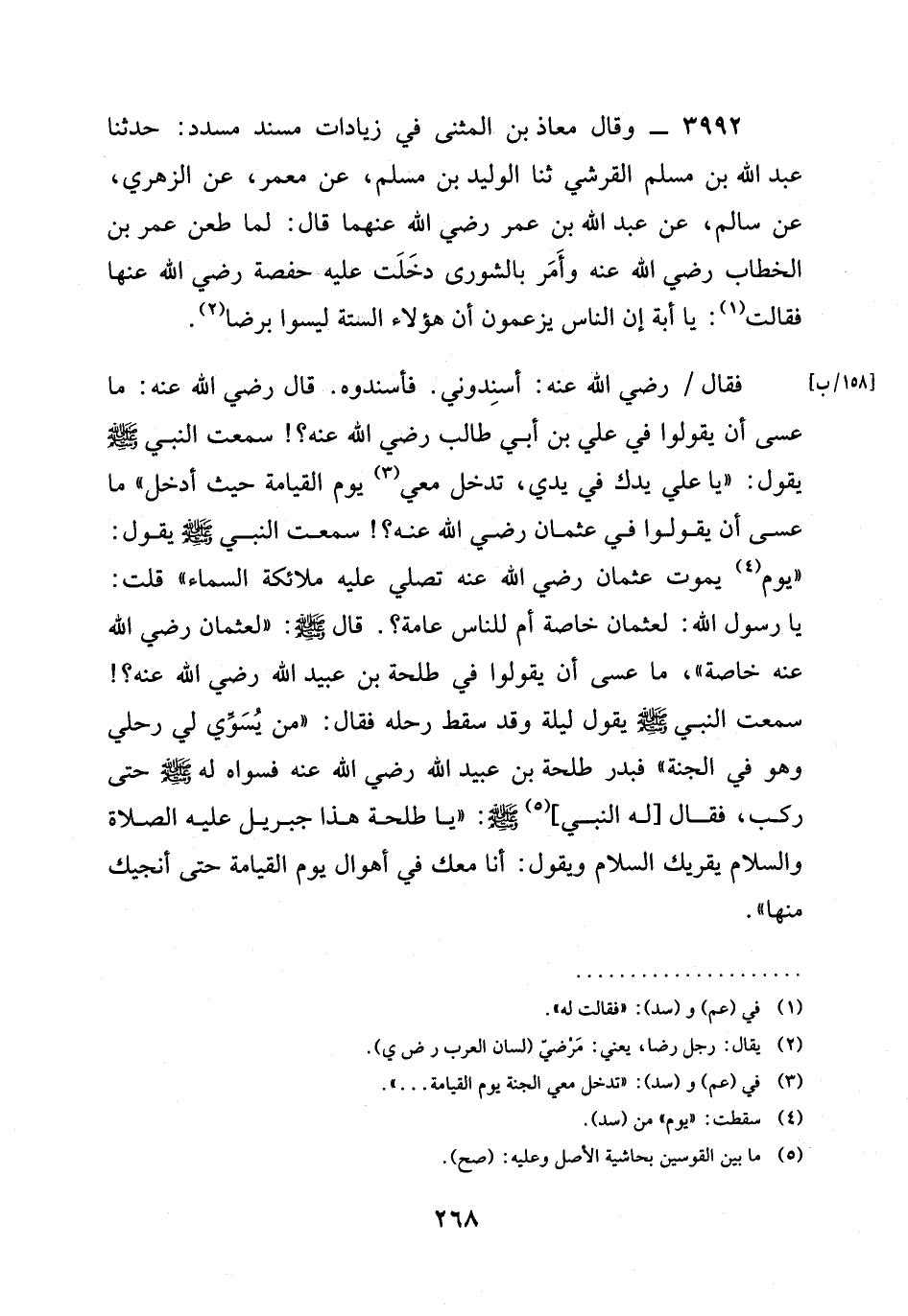 3992 - وَقَالَ مُعَاذُ بْنُ الْمُثَنَّى فِي زِيَادَاتِ مُسْنَدِ مُسَدَّدٍ: حدثنا عَبْدُ اللَّهِ بْنُ مُسْلِمٍ الْقُرَشِيُّ ثنا الْوَلِيدُ بْنُ مُسْلِمٍ، عَنْ مَعْمَرٍ، عَنِ الزُّهْرِيِّ، عَنْ سَالِمٍ، عَنْ عَبْدِ اللَّهِ بْنِ عمر رَضِيَ الله عَنْهما قَالَ: لَمَّا طُعِنَ عُمَرُ بْنُ الْخَطَّابِ رَضِيَ الله عَنْه وَأَمَرَ بِالشُّورَى دَخَلَتْ عليه حفصة رَضِيَ الله عَنْها فقالت: يا أبة إِنَّ النَّاسَ يَزْعُمُونَ أَنَّ هَؤُلَاءِ السِّتَّةَ لَيْسُوا بِرضًا.