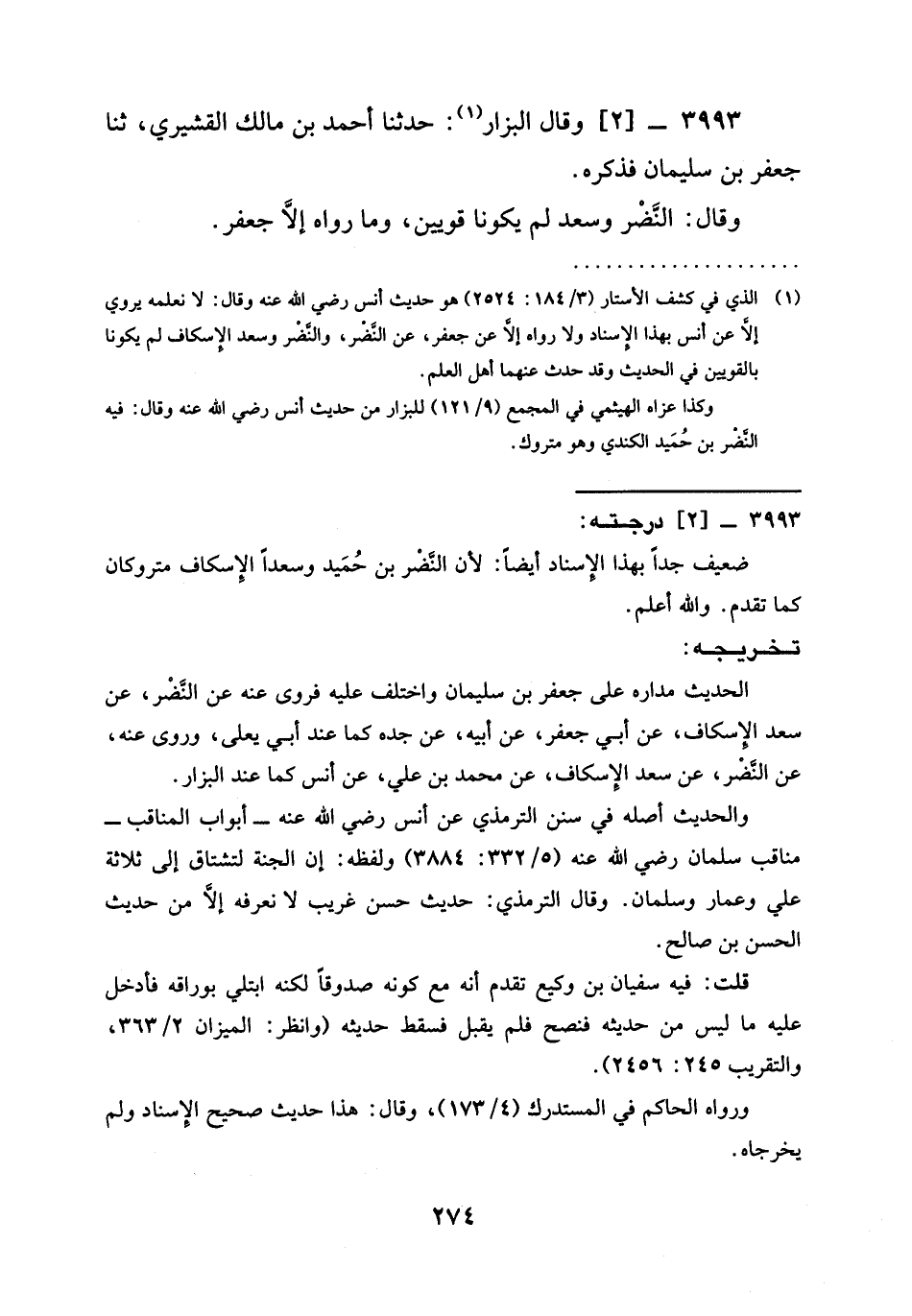 3993 - [2] وَقَالَ الْبَزَّارُ (¬1): حَدَّثَنَا أَحْمَدُ بْنُ مَالِكٍ الْقُشَيْرِيُّ، ثنا جَعْفَرُ بْنُ سُلَيْمَانَ فَذَكَرَهُ.