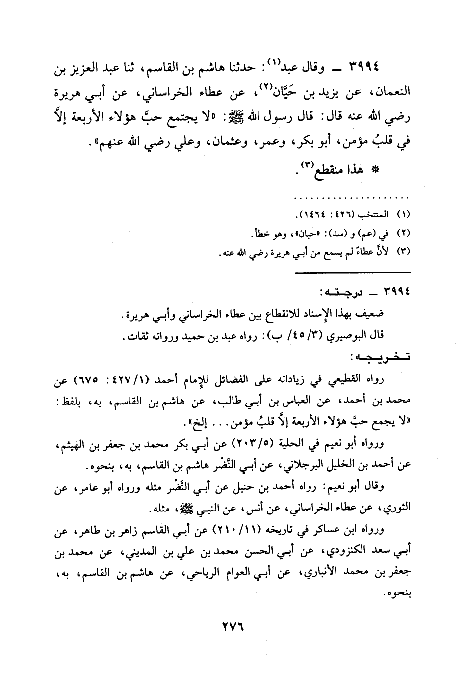3994 - وَقَالَ عَبْدُ: حَدَّثَنَا هَاشِمُ بْنُ الْقَاسِمِ، ثنا عَبْدُ الْعَزِيزِ بْنُ النُّعْمَانِ، عَنْ يَزِيدَ بْنِ حَيَّانَ، عَنْ عَطَاءٍ الْخُرَاسَانِيِّ، عَنْ أَبِي هُرَيْرَةَ رَضِيَ الله عَنْه قَالَ: قَالَ رَسُولُ اللَّهِ صَلَّى اللَّهُ عَلَيْهِ وَسَلَّمَ: " §لَا يَجْتَمِعُ حُبُّ هَؤُلَاءِ الْأَرْبَعَةِ إِلَّا فِي قَلْبِ مُؤْمِنٍ، أَبُو بَكْرٍ، وَعُمَرُ، وعثمان، وعلي رَضِيَ الله عَنْهم ".