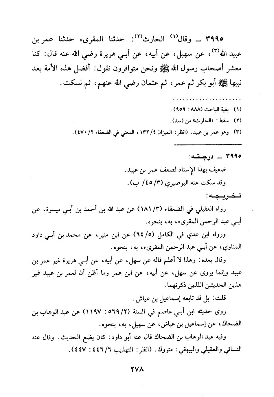 3995 - وقال الْحَارِثُ: حدثنا الْمُقْرِئُ حدثنا عُمَرُ بْنُ عُبَيْدٍ الله، عَنْ سُهَيْلٍ، عَنْ أَبِيهِ، عَنْ أَبِي هُرَيْرَةَ رَضِيَ الله عَنْه قَالَ: كُنَّا مَعْشَرَ أَصْحَابِ رَسُولِ اللَّهِ صَلَّى اللَّهُ عَلَيْهِ وَسَلَّمَ وَنَحْنُ مُتَوَافِرُونَ نَقُولُ: §أَفْضَلُ هَذِهِ الْأُمَّةِ بَعْدَ نَبِيِّهَا صَلَّى اللَّهُ عَلَيْهِ وَسَلَّمَ أَبُو بَكْرٍ ثُمَّ عُمَرُ، ثم عثمان رَضِيَ الله عَنْهم، ثُمَّ نَسَكْتُ.