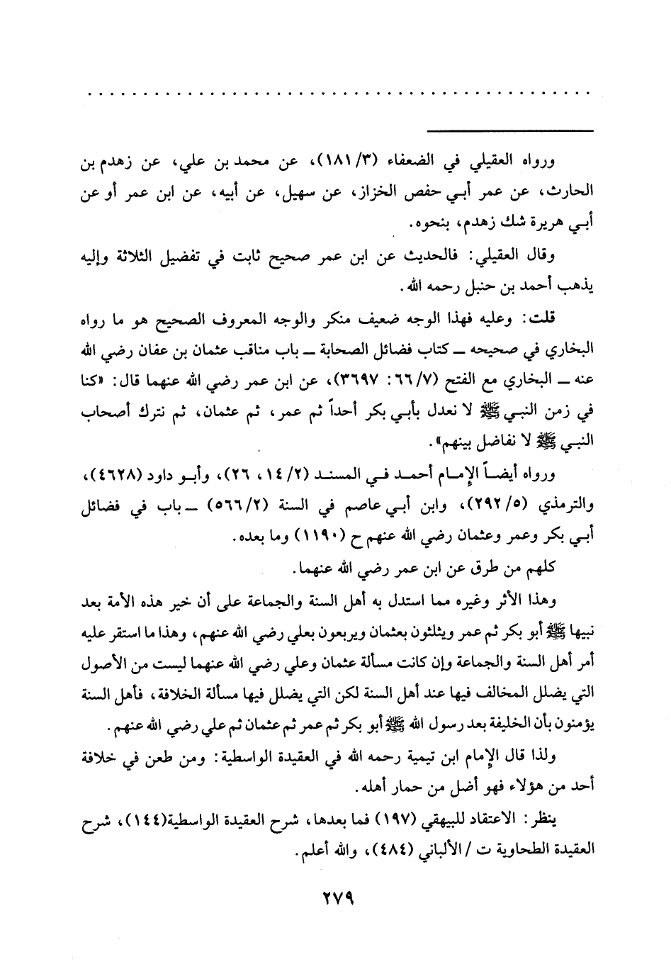 وقال العقيلي: فالحديث عن ابن عمر صحيح ثابت في تفضيل الثلاثة وإليه يذهب أحمد بن حنبل رحمه الله.