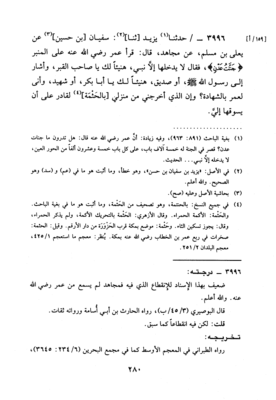 3996 - / حدثنا يَزِيدُ [ثنا] : سُفْيَانُ [بْنُ حُسَيْنٍ] عَنْ يَعْلَى بْنِ مُسْلِمٍ، عن مجاهد، قال: قَرَأَ عُمَرُ رَضِيَ الله عَنْه عَلَى الْمِنْبَرِ {§جَنَّاتُ عَدْنٍ} ، فَقَالَ لَا يَدْخُلُهَا إِلَّا نَبِيٌّ، هَنِيئًا لك يَا صَاحِبَ الْقَبْرِ، وَأَشَارَ إِلَى رَسُولِ اللَّهِ صَلَّى اللَّهُ عَلَيْهِ وَسَلَّمَ، أَوْ صِدِّيقٌ، هَنِيئًا لَكَ يَا أَبَا بَكْرٍ، أَوْ شَهِيدٌ، وَأَنَّى لَعُمَرَ بِالشَّهَادَةِ؟ وَإِنَّ الَّذِي أَخْرَجَنِي مِنْ مَنْزِلِي [بِالْحَثَمَةِ] لَقَادِرٌ عَلَى أَنْ يَسُوقَهَا إِلَيَّ.