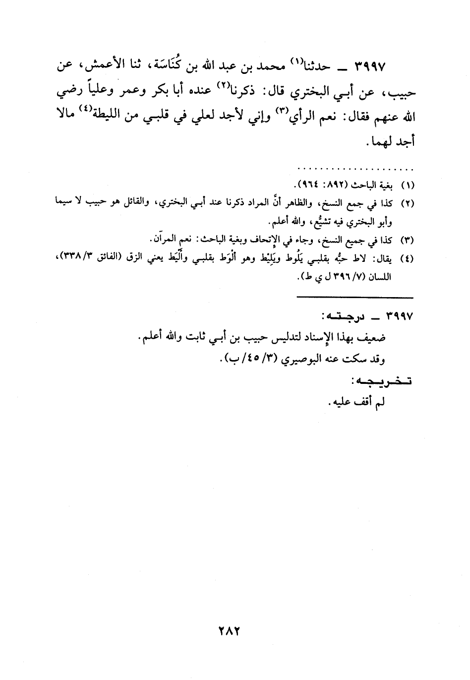 3997 - حَدَّثَنَا مُحَمَّدُ بْنُ عَبْدِ اللَّهِ بْنِ كُنَاسَةَ، ثنا الْأَعْمَشُ، عَنْ حَبِيبٍ، عَنْ أَبِي الْبَخْتَرِيِّ قَالَ: ذَكَرْنَا عِنْدَهُ أَبَا بَكْرٍ وعمر وعليا رَضِيَ الله عَنْهم فَقَالَ: §نِعْمَ الرَّأْي وَإِنِّي لَأَجِدُ لِعَلِيٍّ فِي قَلْبِي مِنَ الليطة مالا أَجِدُ لَهُمَا.