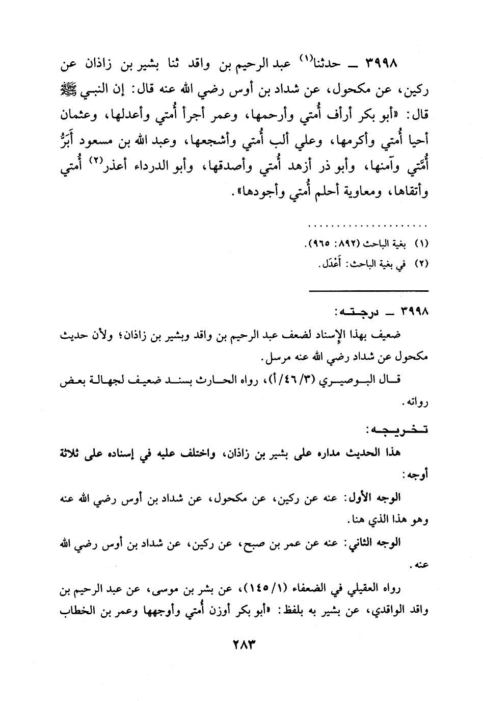 3998 - حَدَّثَنَا عَبْدُ الرَّحِيمِ بْنُ وَاقِدٍ ثنا بَشِيرُ بْنُ زَاذَانَ عَنْ رُكَيْنٍ، عَنْ مَكْحُولٍ، عَنْ شَدَّادِ بْنِ أَوْسٍ رَضِيَ الله عَنْه قَالَ: إِنَّ النَّبِيَّ صَلَّى اللَّهُ عَلَيْهِ وَسَلَّمَ قَالَ: " §أَبُو بَكْرٍ أَرْأَفُ أُمَّتِي وأرحمهما، وَعُمَرُ أَجْرَأُ أُمَّتِي وَأَعْدَلُهَا، وَعُثْمَانُ أحيا أُمَّتِي وَأَكْرَمُهَا، وَعَلِيٌّ أَلَبُّ أُمَّتِي وَأَشْجَعُهَا، وَعَبْدُ اللَّهِ بْنُ مَسْعُودٍ أَبَرُّ أُمَّتِي وَآمَنُهَا، وَأَبُو ذَرٍّ أَزْهَدُ أُمَّتِي وَأَصْدَقُهَا، وَأَبُو الدَّرْدَاءِ أَعْذَرُ أُمَّتِي وَأَتْقَاهَا، وَمُعَاوِيَةُ أَحْلَمُ أُمَّتِي وَأَجْوَدُهَا ".