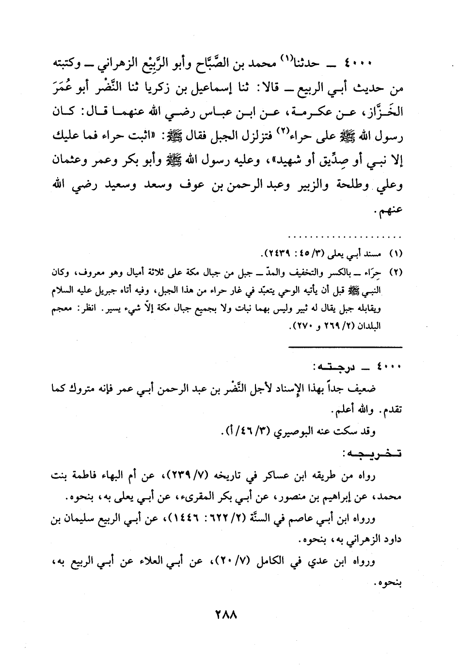 4000 - حَدَّثَنَا مُحَمَّدُ بْنُ الصَّبَّاحِ وَأَبُو الرَّبِيعِ الزَّهْرَانِيُّ - وَكَتَبْتُهُ مِنْ حَدِيثِ أَبِي الرَّبِيعِ - قَالَا: ثنا إِسْمَاعِيلُ بْنُ زَكَرِيَّا ثنا النَّضْرُ أَبُو عُمَرَ الْخَزَّازُ، عَنْ عِكْرِمَةَ، عَنِ ابن عباس رَضِيَ الله عَنْهما قَالَ: كَانَ رَسُولُ اللَّهِ صَلَّى اللَّهُ عَلَيْهِ وَسَلَّمَ عَلَى حِرَاءٍ فَتَزَلْزَلَ الْجَبَلُ فَقَالَ صَلَّى اللَّهُ عَلَيْهِ وَسَلَّمَ: " §اثْبُتْ حِرَاءُ فَمَا عَلَيْكَ إِلَّا نَبِيٌّ أَوْ صِدِّيقٌ أَوْ شَهِيدٌ "، وَعَلَيْهِ رَسُولُ اللَّهِ صَلَّى اللَّهُ عَلَيْهِ وَسَلَّمَ وَأَبُو بَكْرٍ وَعُمَرُ وَعُثْمَانُ وَعَلِيٌّ وَطَلْحَةُ وَالزُّبَيْرُ وَعَبْدُ الرَّحْمَنِ بْنُ عَوْفٍ وسعد وسعيد رَضِيَ الله عَنْهم.