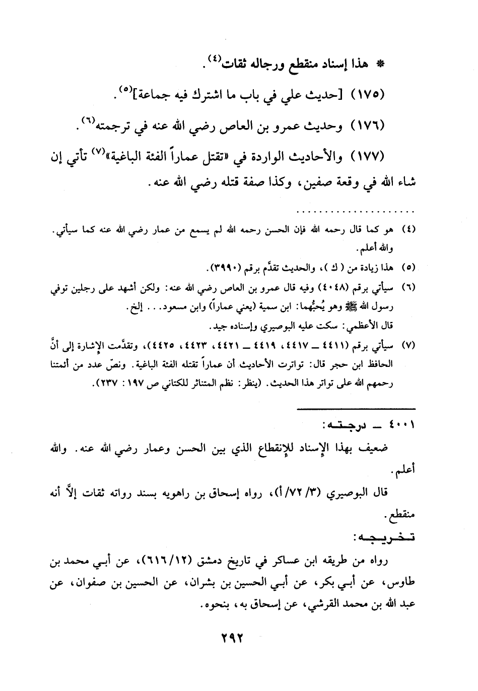 (¬7) سيأتي برقم (4411 - 4417، 4419 - 4421، 4423، 4425)، وتقدَّمت الإشارة إلى أنَّ الحافظ ابن حجر قال: تواترت الأحاديث أن عمارًا تقتله الفئة الباغية. ونصّ عدد من أئمتنا رحمهم الله على تواتر هذا الحديث. (ينظر: نظم المتناثر للكتاني ص 197: 237).