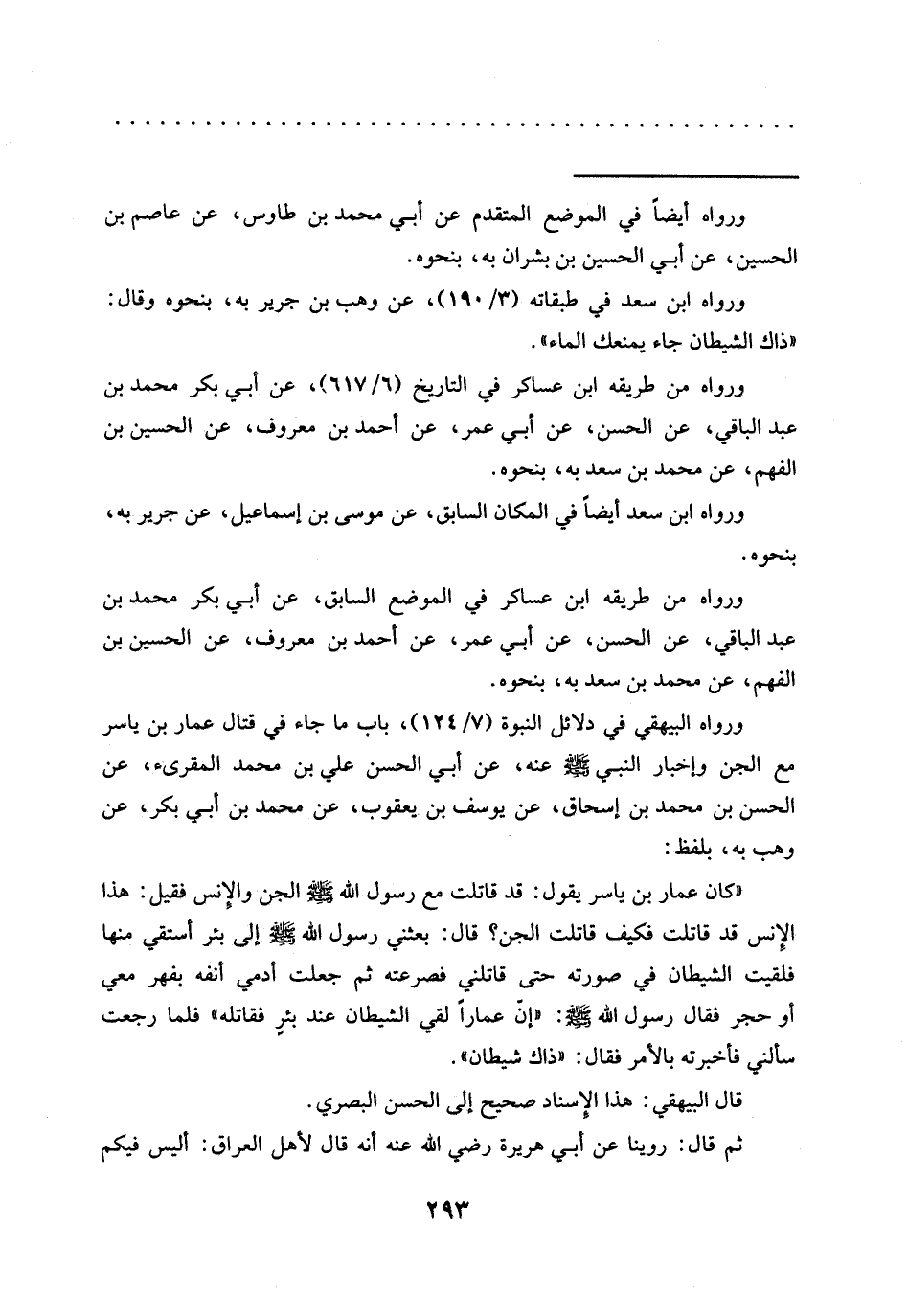 "كان عمار بن ياسر يقول: قد قَاتَلَتُ مَعَ رَسُولِ اللَّهِ -صَلَّى اللَّهُ عَلَيْهِ وَسَلَّمَ- الجن والإنس فقيل: هذا الإنس قد قاتلت فكيف قاتلت الجن؟ قَالَ: بَعَثَنِي رَسُولُ اللَّهِ -صَلَّى اللَّهُ عَلَيْهِ وسلم- إلى بئر أستقي منها فلقيت الشيطان في صورته حتى قاتلني فصرعته ثم جعلت أدمي أنفه بفهر معي أو حجر فَقَالَ رَسُولُ اللَّهِ -صَلَّى اللَّهُ عَلَيْهِ وَسَلَّمَ-: "إنّ عمارًا لقي الشيطان عند بئرٍ فقاتله" فلما رجعت سألني فأخبرته بالأمر فقال: "ذاك شيطان".
