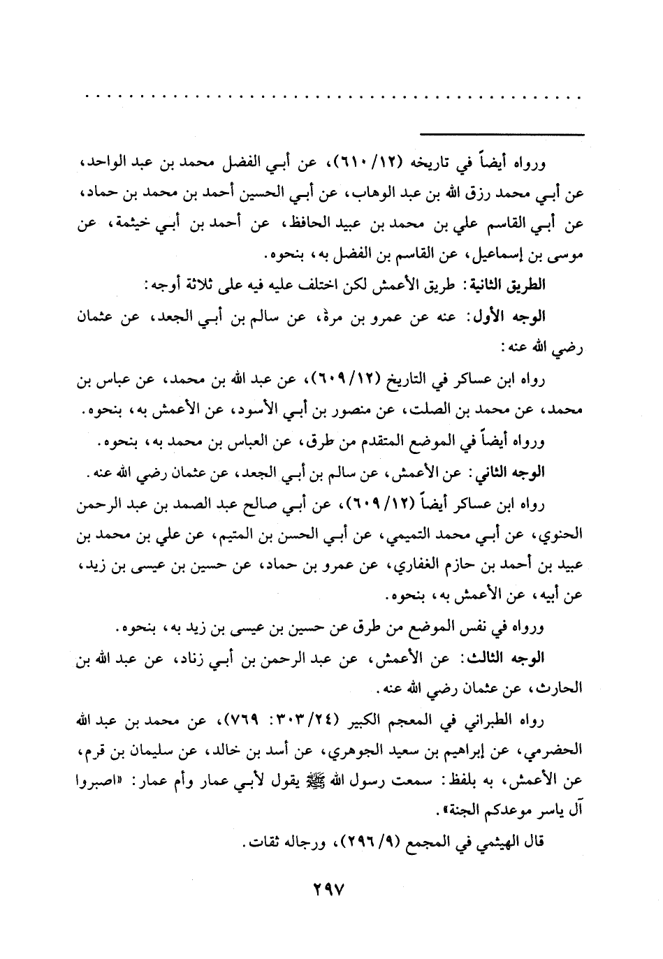 رواه ابن عساكر أيضًا (12/ 609)، عن أبي صالح عبد الصمد بن عبد الرحمن الحنوي، عن أبي محمَّد التميمي، عن أبي الحسن بن المتيم، عن علي بن محمَّد بن عبيد بن أحمد بن حازم الغفاري، عن عمرو بن حماد، عن حسين بن عيسى بن زيد، عن أببه، عن الأعمش به، بنحوه.