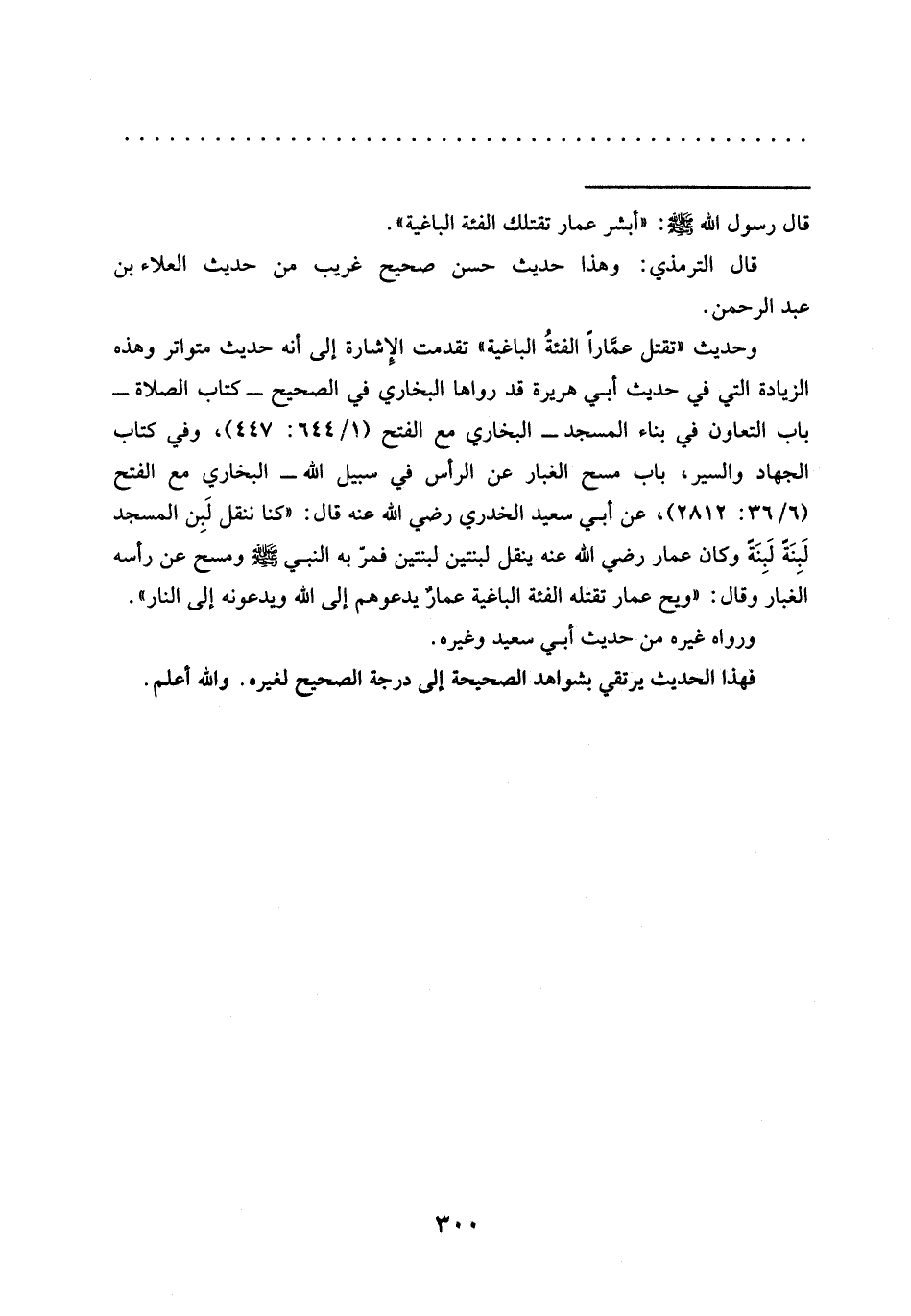 وحديث "تقتل عمَّارًا الفئةُ الباغية" تقدمت الإشارة إلى أنه حديث متواتر وهذه الزيادة التي في حديث أبي هريرة قد رواها البخاري في الصحيح -كتاب الصلاة- باب التعاون في بناء المسجد -البخاري مع الفتح (1/ 644: 447)، وفي كتاب الجهاد والسير، باب مسح الغبار عن الرأس في سبيل الله- البخاري مع الفتح (6/ 36: 2812)، عَنْ أَبِي سَعِيدٍ الْخُدْرِيِّ رَضِيَ اللَّهُ عَنْهُ قال: "كنا ننقل لَبِن المسجد لَبِنَةَ لَبِنَةً وكان عمار رضي الله عنه ينقل لبنتين لبنتين فمرّ به النبي -صلى الله عليه وسلم- ومسح عن رأسه الغبار وقال: "ويح عمار تقتله الفئة الباغية عمارٌ يدعوهم إلى الله ويدعونه إلى النار".